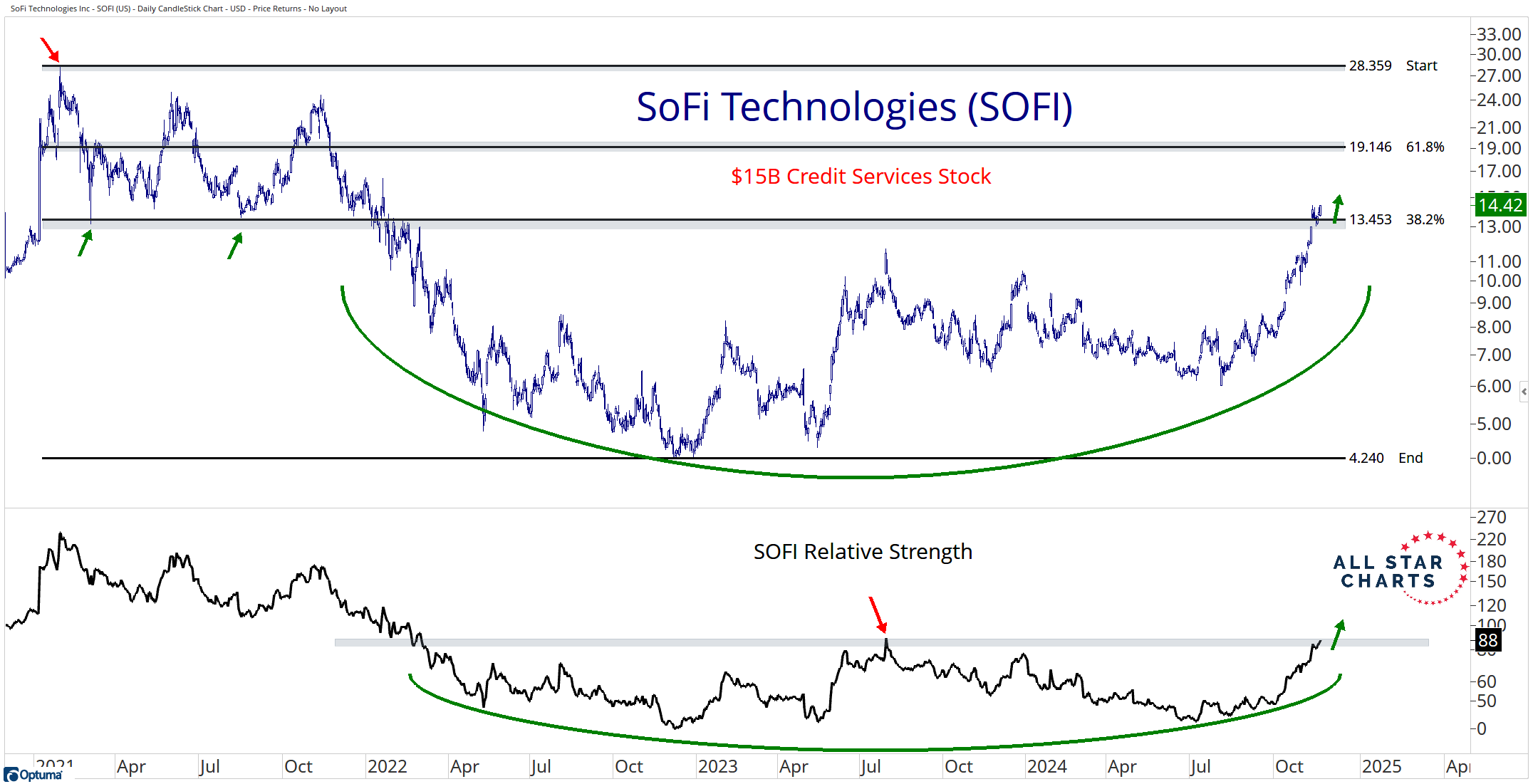 On a relative basis, the SOFI is looking ready to emerge from a similar reversal pattern versus the overall market. If this breakout holds on absolute terms, we expect the stock to continue outperforming its peers in the foreseeable future.