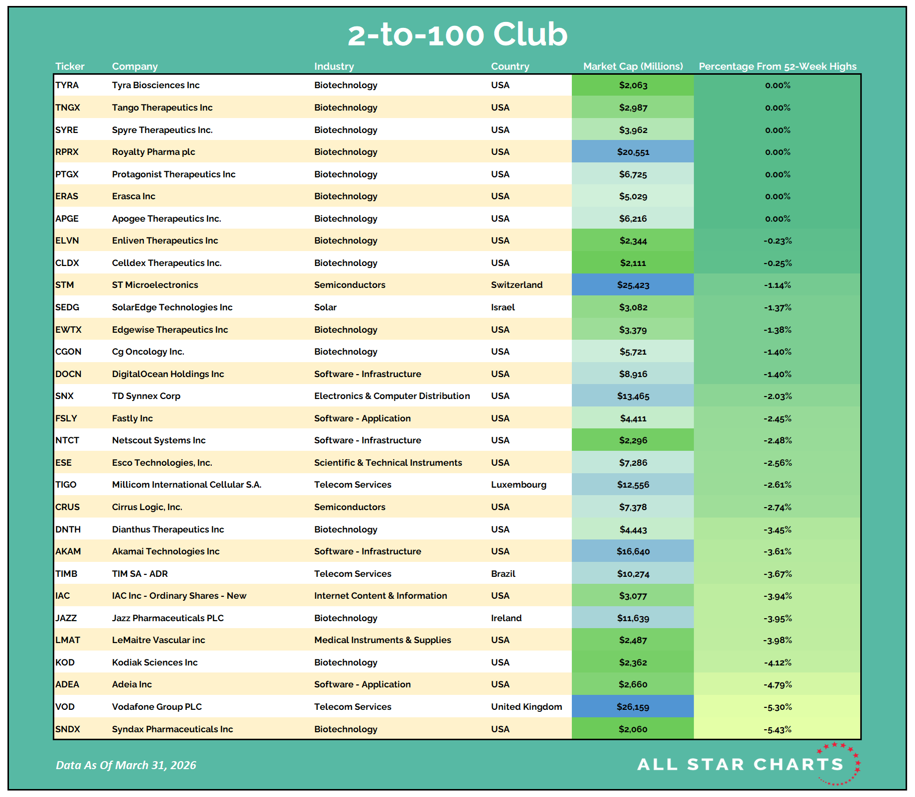 Once they graduate from small-cap to mid-cap status (over $2B), they come on our radar. Likewise, when they surpass the roughly $30B mark, they roll off our list.