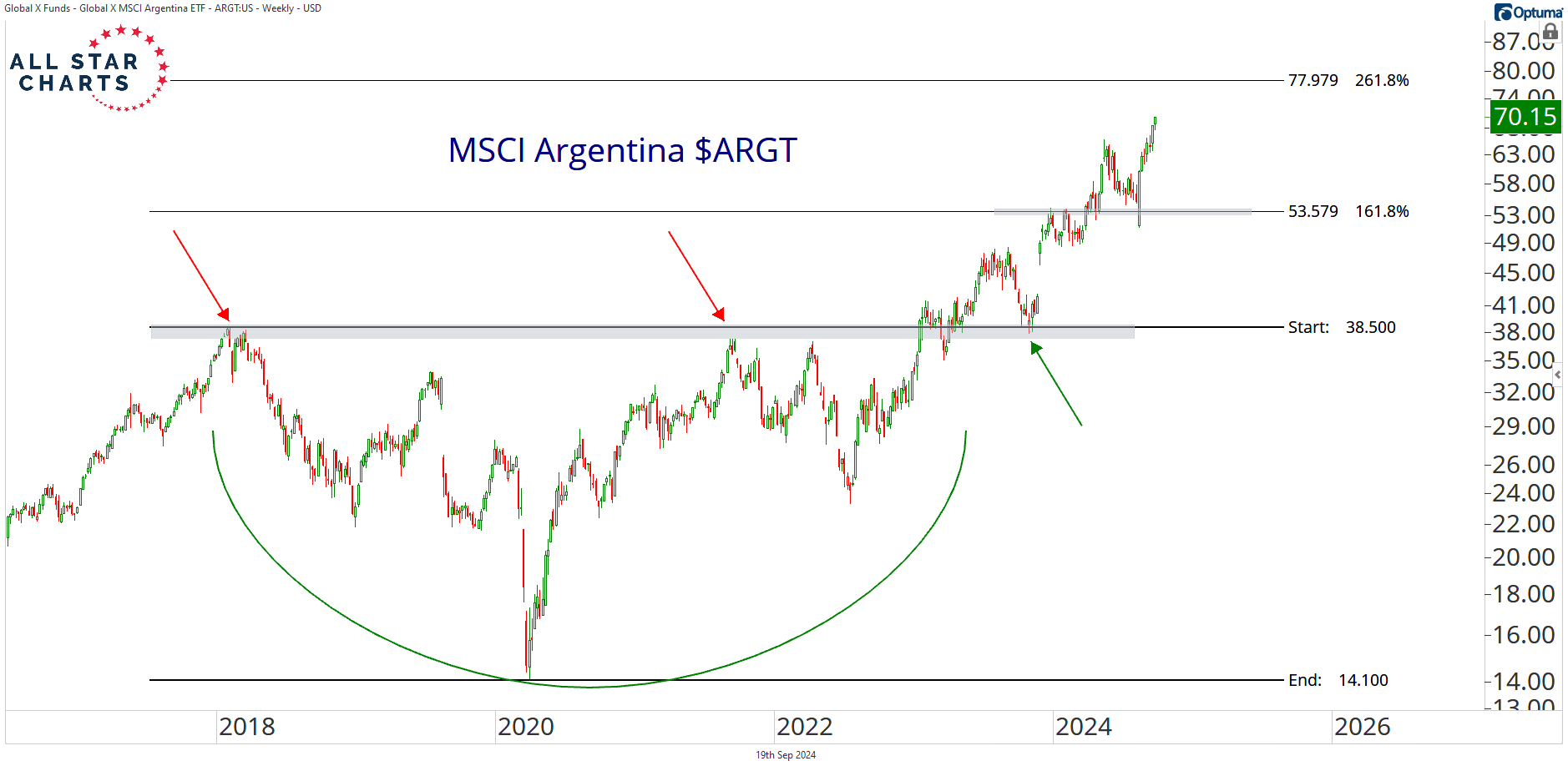 As you can see, ARGT has been stair-stepping higher in a near-vertical line, since it gapped up in November following the election last year.