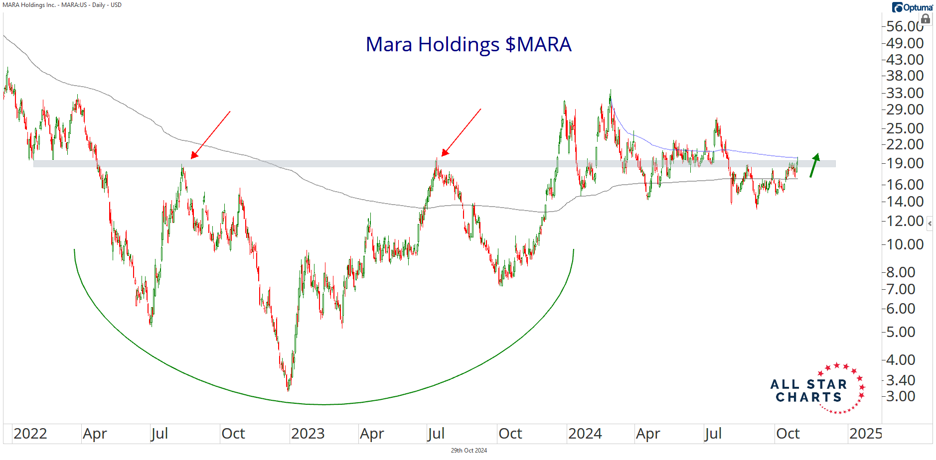 Alfonso's Daily Note Alfonso De Pablos highlights the day’s most important market-moving chart. Getting Exposure to Crypto Miners By Alfonso Depablos, CMT October 29, 2024 Bitcoin is flirting with a historic breakout, sitting just a few bucks shy of fresh all-time highs.Everywhere I look, I’m seeing the perfect setup for a new leg higher from crypto.Risk appetite is heating up across the board, and the strongest tokens are leaving the station. We have a wide-variety of vehicles to choose from to play this bullish thesis.Whether you look at Bitcoin, Dogecoin, or the crypto miners, they are all offering asymmetrical risk vs reward opportunities.And if we're talking about catch-up trades, Marathon Digital Holdings $MARA is the one to watch. Just look how clean this chart is.Price has been coiling in a tight range below a shelf of former highs, offering a clear level to define our risk and trade against.If BTC skyrockets, we want to bet on the miners running higher alongside it.These trades should also come with a good deal of juice.The miners represent some of the highest-beta vehicles and are an effective way to gain leveraged exposure to crypto.I’m putting on some trades right here, right now, in MARA and friends.I think MARA has plenty of room to catch up to its crypto peers… and I think that move is coming underway now.We just sold a double in our call options in Riot Platforms. MARA should be next.Everyone is on board with this theme right now.Sean hates Bitcoin miners, but even he put on a new options trade in MARA today. If you’re interested in getting the trade details, click here.The bottom line is we’re all buying BTC stocks and positioning for a big breakout. How are you preparing for BTC 100k?Hope you enjoyed this post!Alfonso. More from Alfonso's Daily Note Alfonso Depablos, CMT The Return of the Trump Trade November 6, 2025 Alfonso Depablos, CMT Who’s Got It Right? November 5, 2025 Alfonso Depablos, CMT Weak Spots in a Bull Market November 4, 2025 See the Chart That MattersAlfonso’s Chart of the Day highlights the setups and inflection points shaping the next big market moves — before they hit the headlines. You must have JavaScript enabled to use this form. Email Address