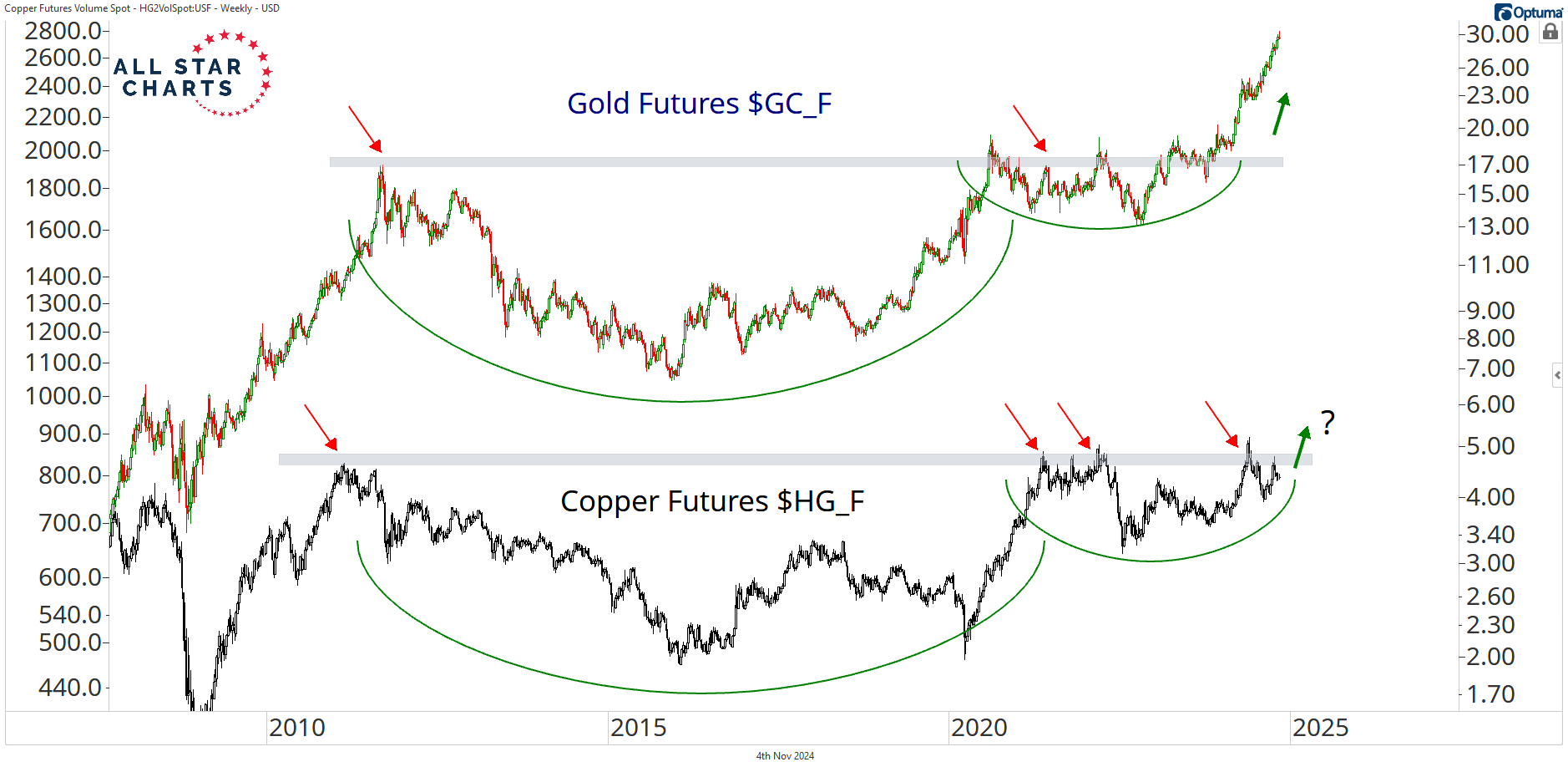 The 2011 highs are the line in the sand. If and when it breaks above this area, we should expect Dr. Copper follows gold in a big way.