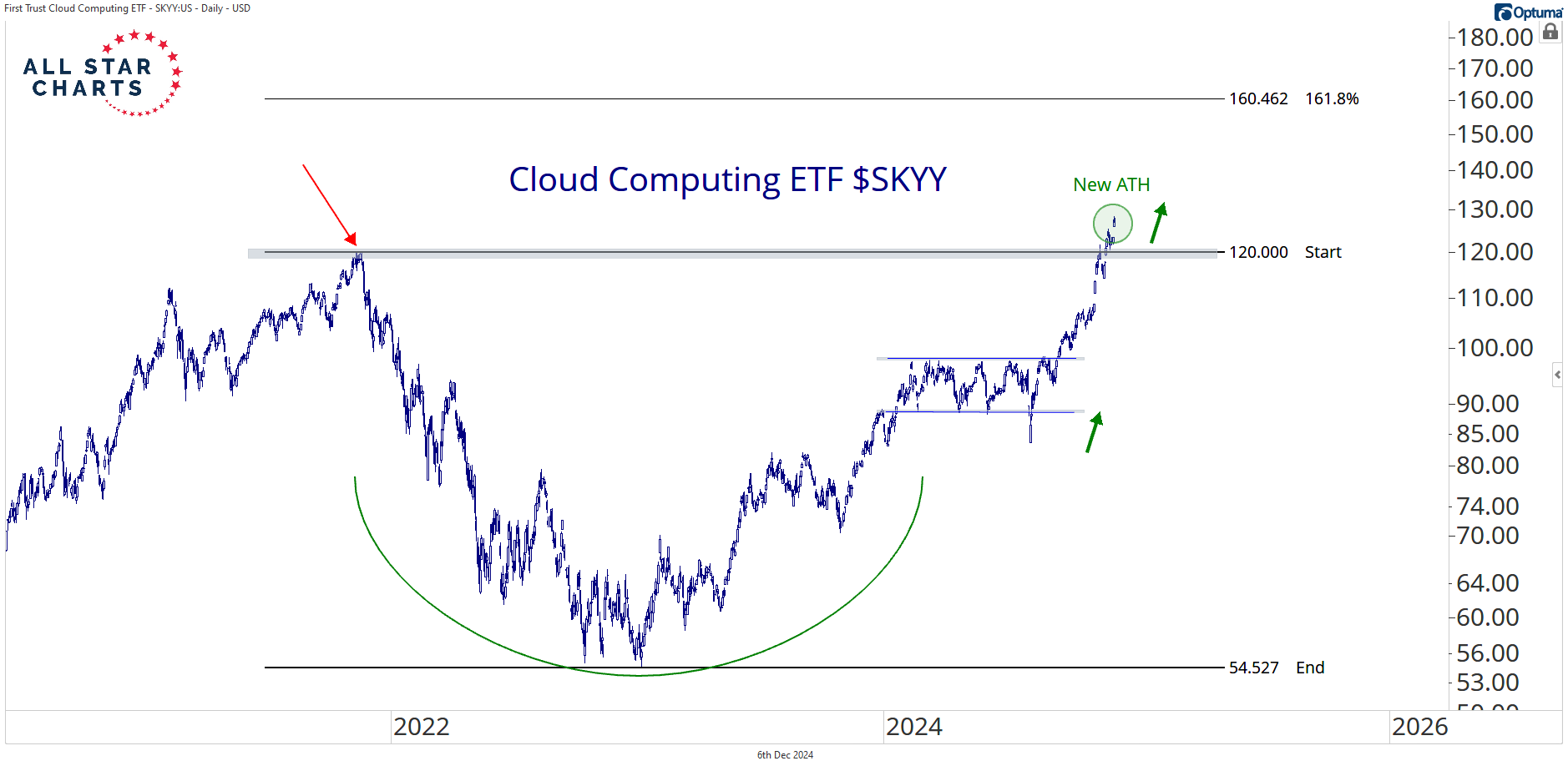 Alfonso's Daily Note Alfonso De Pablos highlights the day’s most important market-moving chart. SKYY’s the Limit By Alfonso Depablos, CMT December 6, 2024 Lately, it’s become almost routine to see tech-related groups hitting fresh highs across the board. From Software and Internet to Cybersecurity, Digital Payments, and Fintech, the strength in these sub-sectors has been nothing short of remarkable.Now we can add the Cloud Computing ETF $SKYY to this impressive list of tech indexes breaking out to new all-time highs. Price just took out a critical resistance level at the prior cycle highs from 2021, surging past 120 without looking back. This level now serves as a key threshold to watch on any corrective action. Will former resistance turn into support?As long as SKYY holds above those old highs, the path of least resistance remains up and to the right, setting the stage for more gains.Alfonso More from Alfonso's Daily Note Alfonso Depablos, CMT The Return of the Trump Trade November 6, 2025 Alfonso Depablos, CMT Who’s Got It Right? November 5, 2025 Alfonso Depablos, CMT Weak Spots in a Bull Market November 4, 2025 See the Chart That MattersAlfonso’s Chart of the Day highlights the setups and inflection points shaping the next big market moves — before they hit the headlines. You must have JavaScript enabled to use this form. Email Address