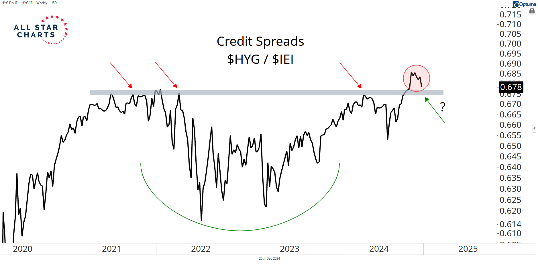 When investors are willing to take on more risk, this ratio typically trends higher. On the other hand, when caution takes over and safety becomes the priority, credit spreads widen, and this ratio declines.