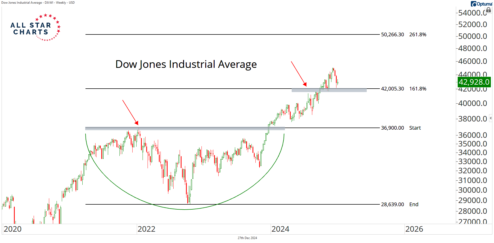 Right now, the Dow is sitting at a critical Fibonacci extension level, around 42,000. That also lines up with the July highs, adding more weight to this key area.