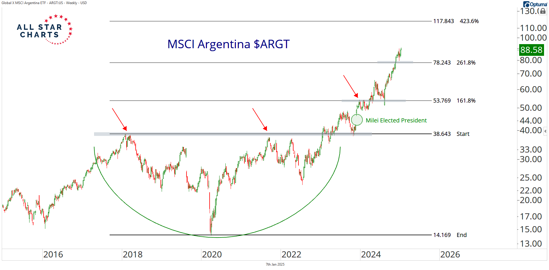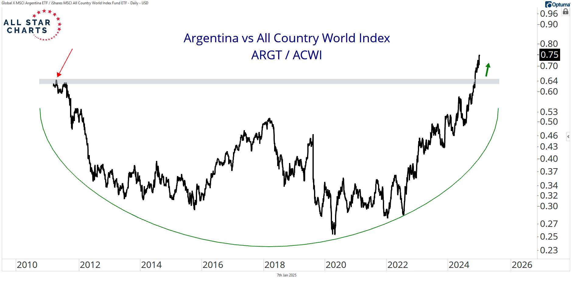 The relative strength here is literally off the charts with ARGT making fresh record highs vs global equities.
