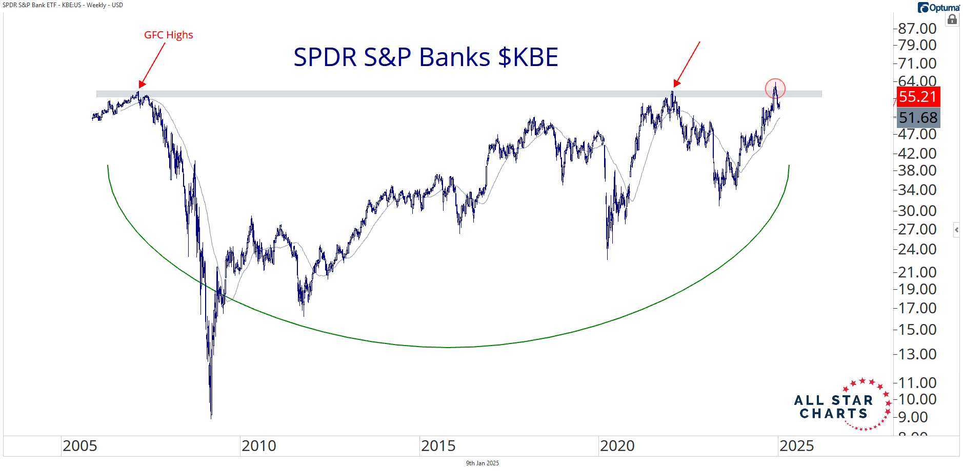 The SPDR S&P Banks ETF $KBE took a shot at breaking out of this monster base following November’s election. This marks the second attempt at reclaiming its pre-GFC highs in the past few years.