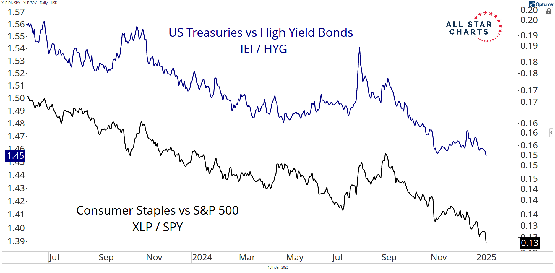 Overlaying the Treasuries versus High-Yield ratio (IEI/HYG) with the Staple vs S&P 500 ratio (XLP/SPY), you’ll notice they move in the same direction.
