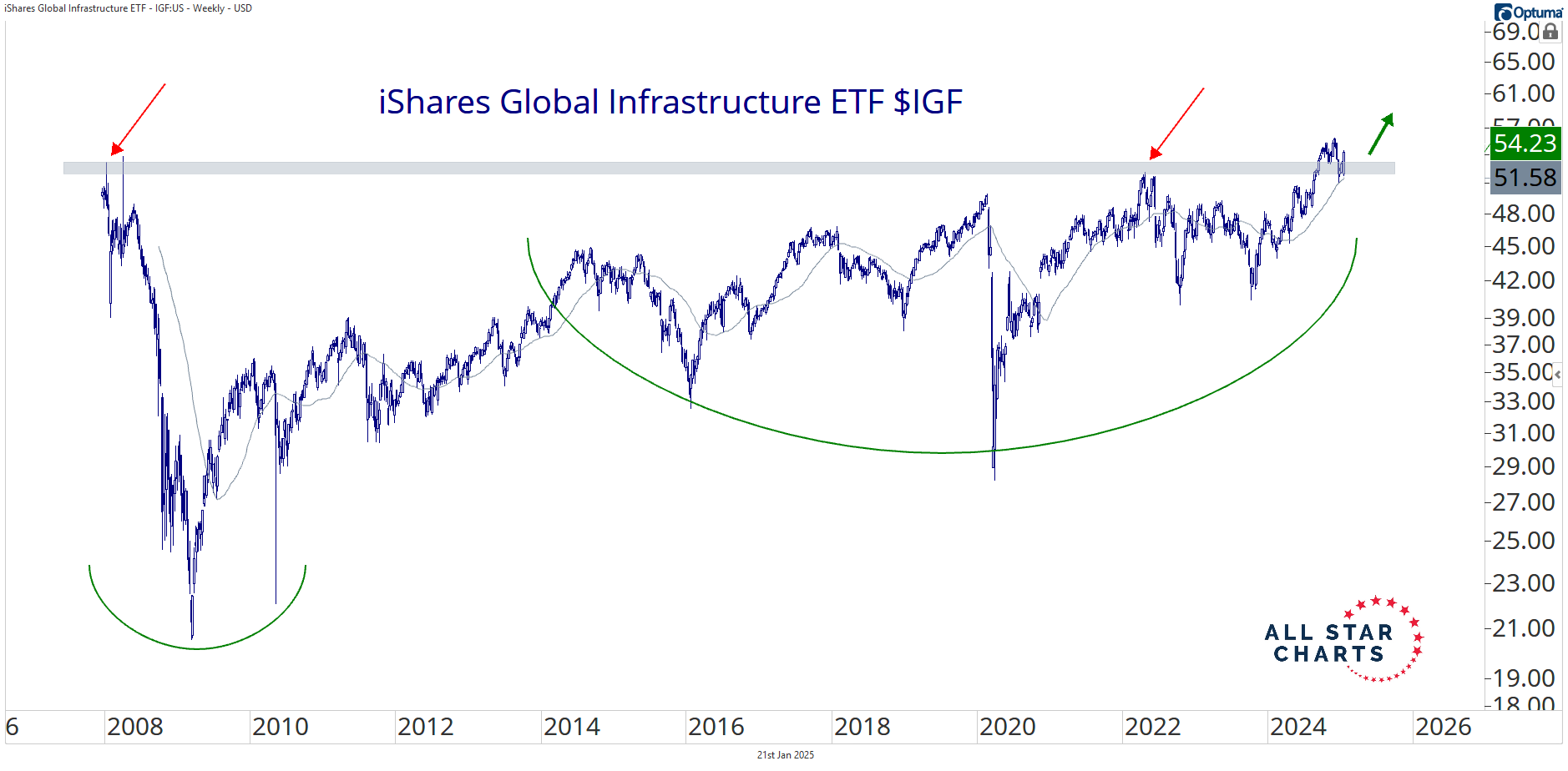 After 17 years of no progress, the iShares Global Infrastructure ETF $IGF is now challenging its pre-financial crisis highs as buyers work to complete a massive base.