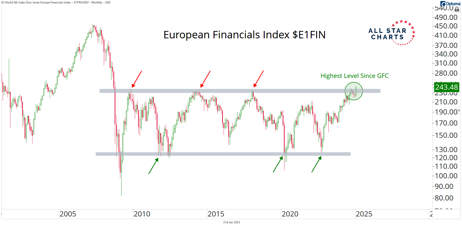 The European Financials Index $E1FIN just closed the month at its highest level since the Great Financial Crisis.