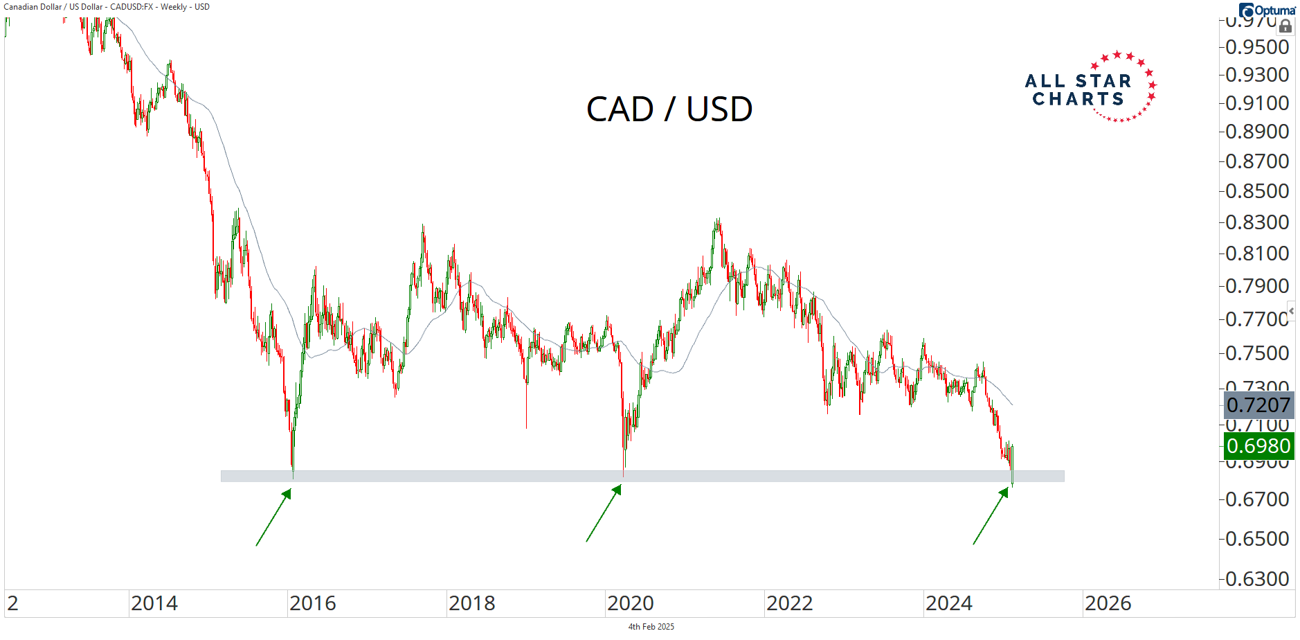 CAD/USD is pressing against a decade-long support zone, hovering around a key level that triggered strong reversals in 2016 and 2020.