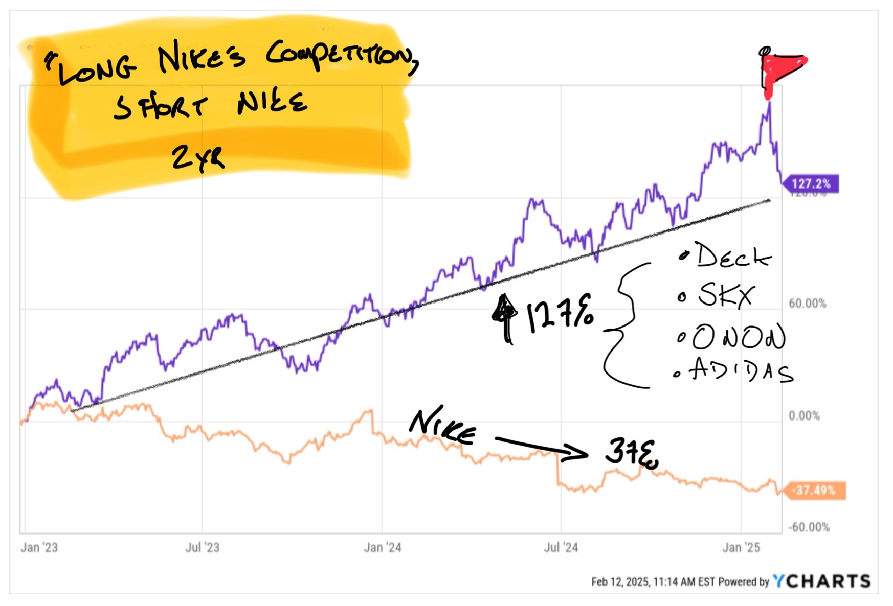 The way to make money is to figure out who's gaining share and figuring out ways to trade around the bigger trend. For the last two years the best opportunity in fashion has been buying the companies that benefit from the slow, grim collapse of the Nike empire.