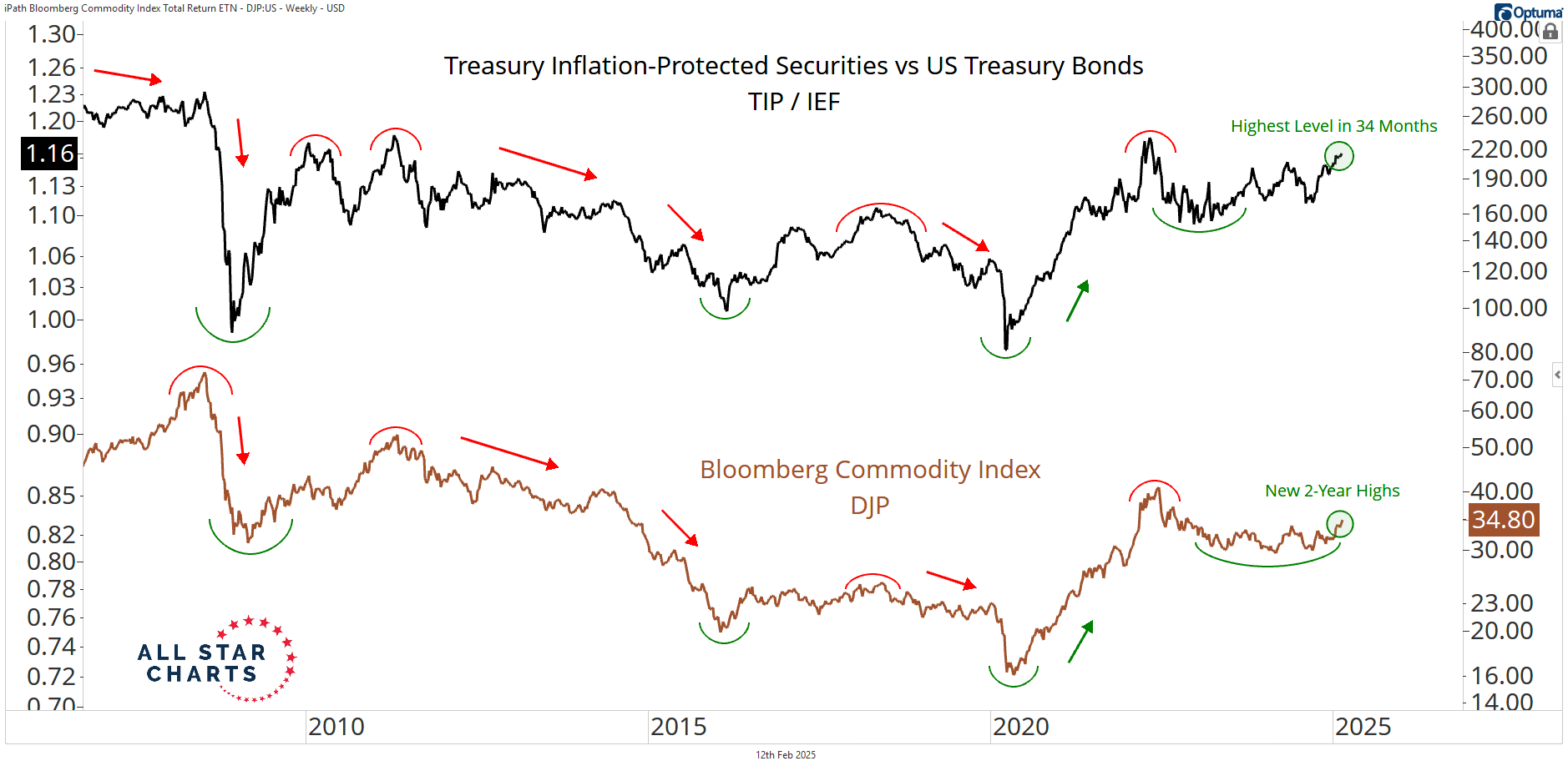 When it comes to inflation expectations, the Treasury Inflation-Protected Securities vs the US Treasury Bonds ratio is one of the best ways to measure it.