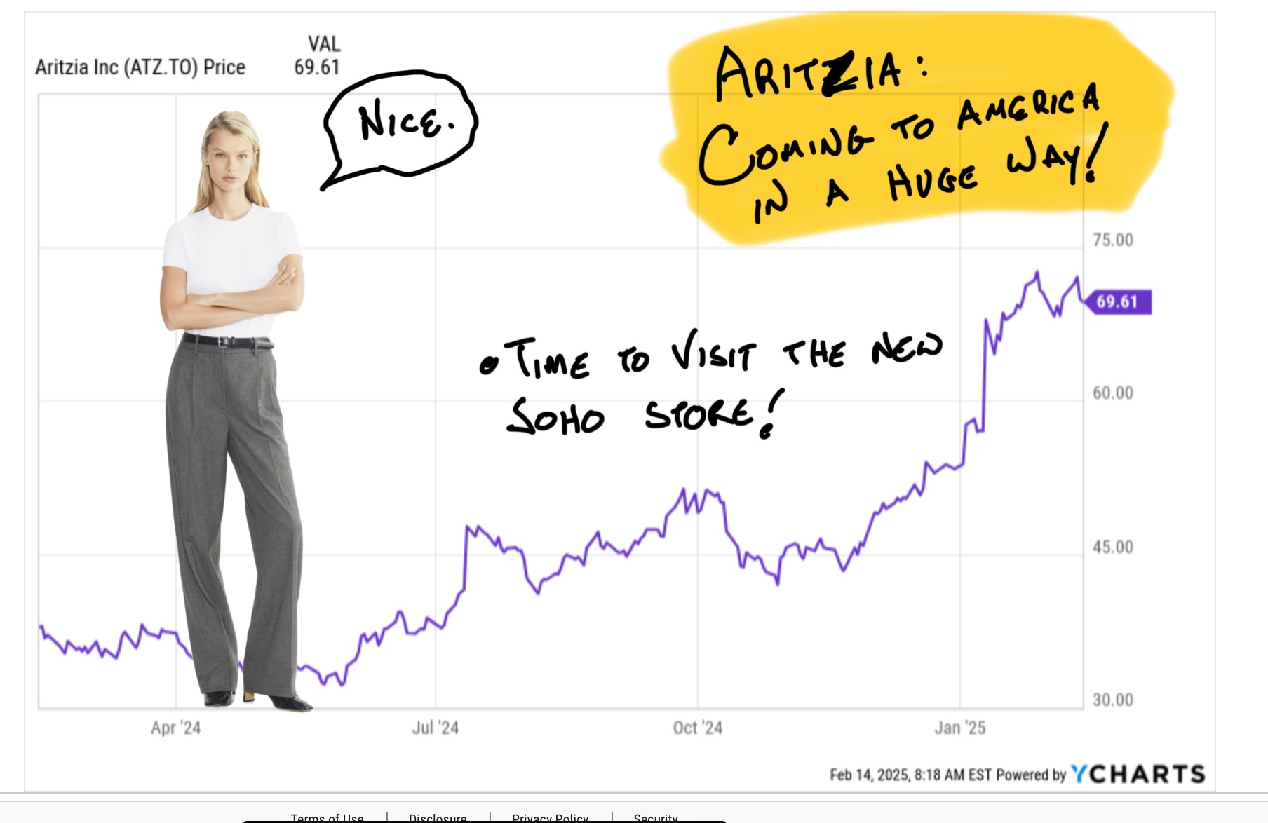 Aritzia is a Canadian seller of affordable luxury apparel for working women. They make nice clothes for women who want tasteful and classy without a librarian vibe. The company designs its own stuff, and they are great at it, but what excites me more about the stock is that Aritzia makes great stores. They are the kinds of places husbands feel ok chilling at while their wives/girlfriends shop.