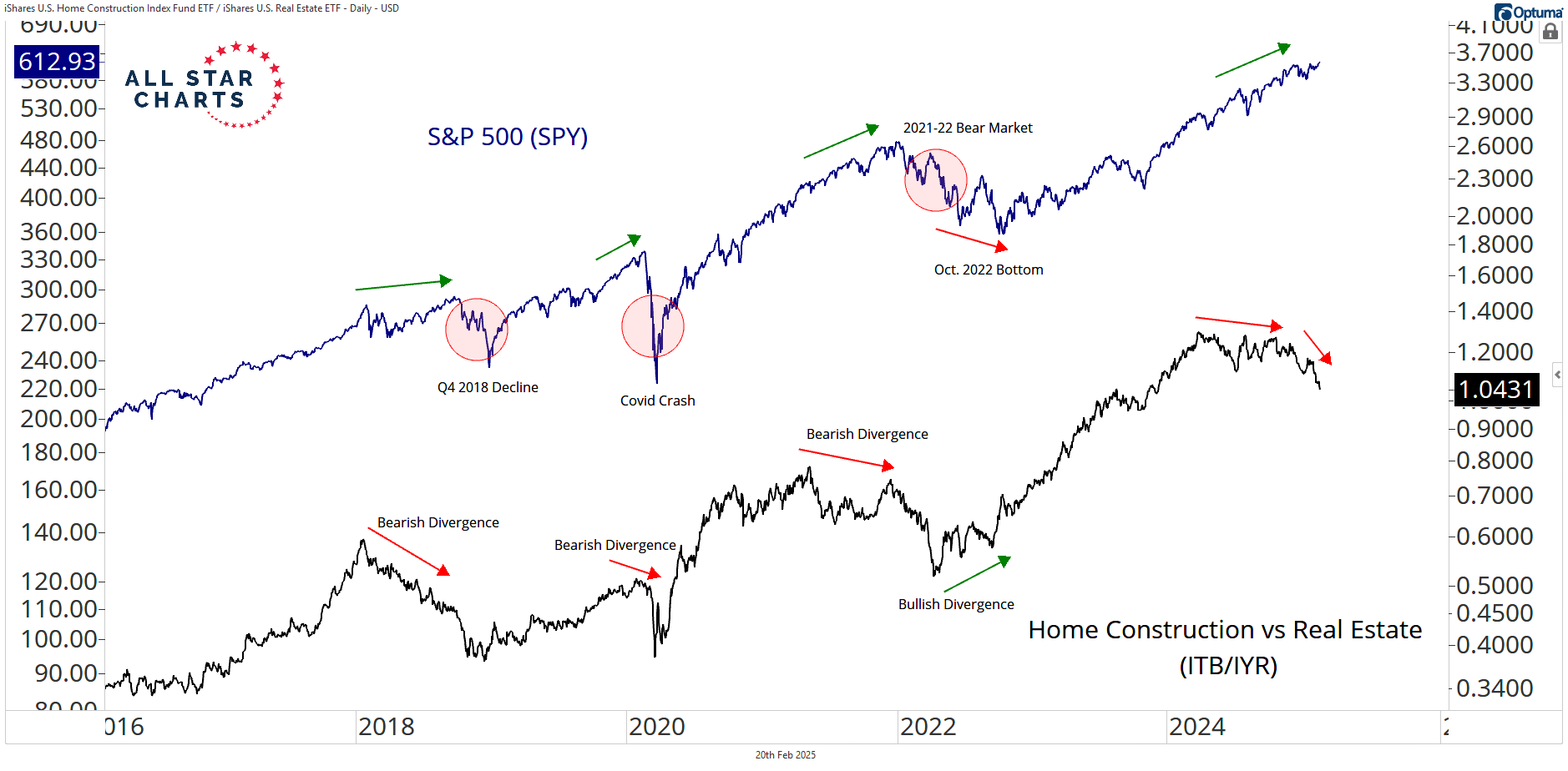 You can see clear divergences where ITB/IYR tops or bottoms ahead of major turns in the S&P 500 during prior cycles.