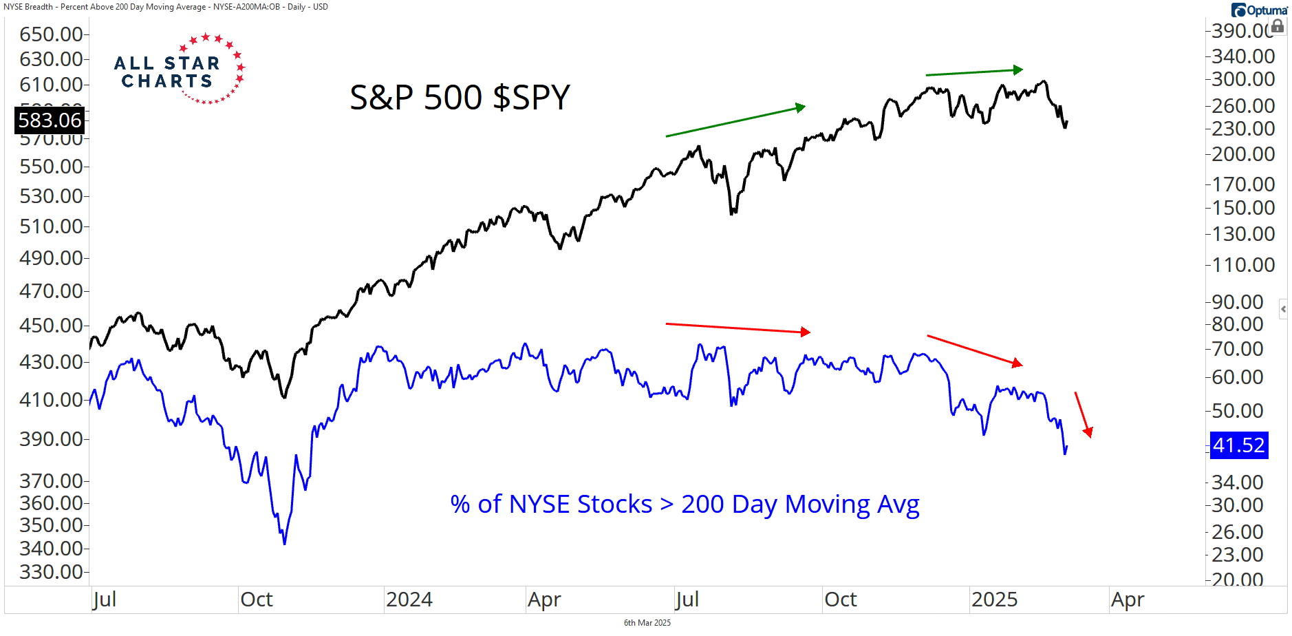 The chart below shows the S&P 500 overlaid with the percentage of NYSE stocks above their 200-day moving average.