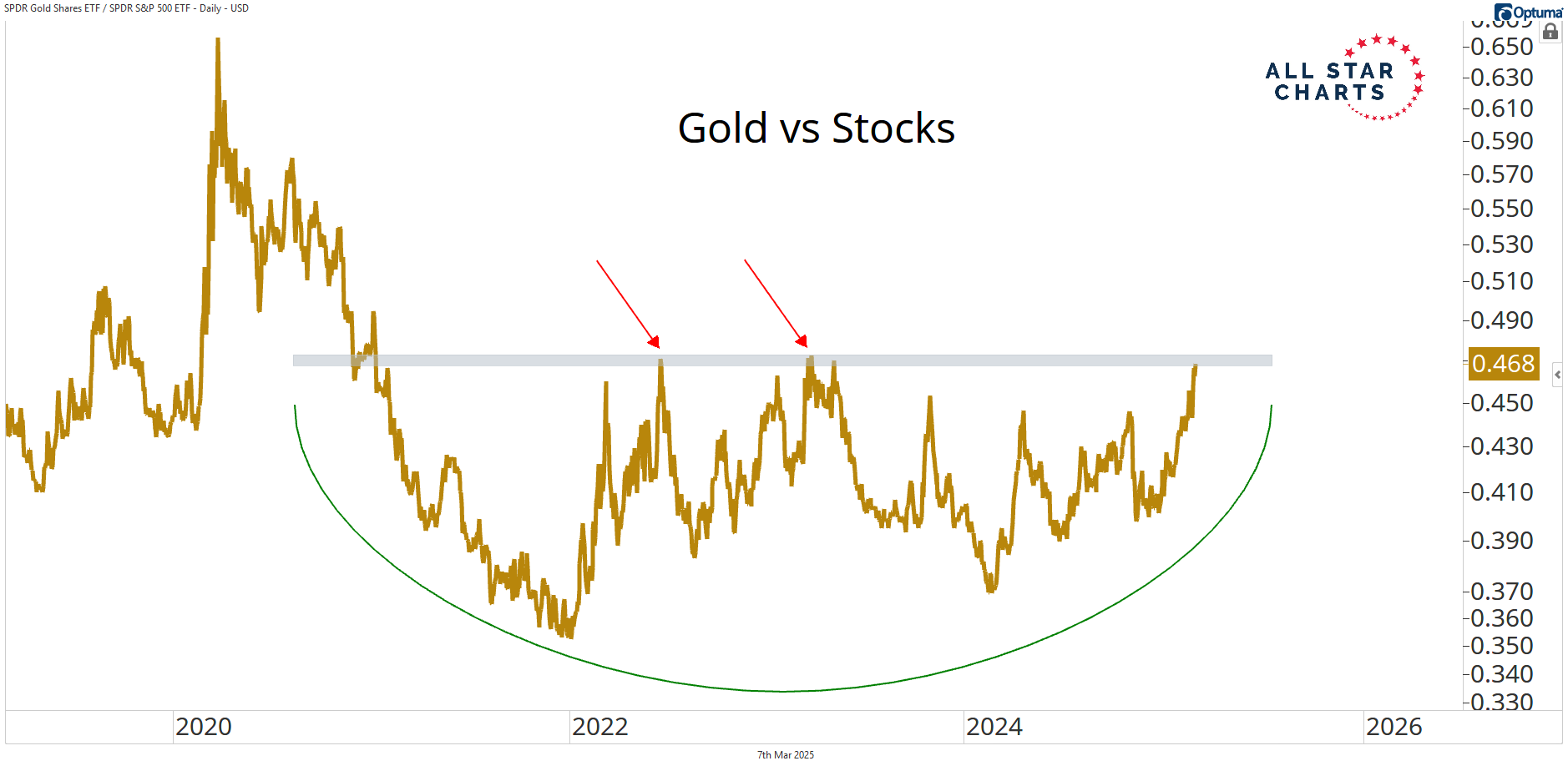 If we see gold breaking out of this base, then it will be time to favor rocks over stocks aggressively.