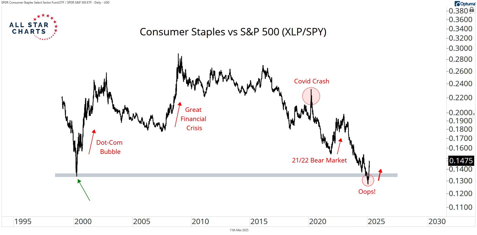 Alfonso's Daily Note Alfonso De Pablos highlights the day’s most important market-moving chart. Things You Don’t See in a Bull Market By Alfonso Depablos, CMT March 11, 2025 A couple of weeks ago, the analyst team and I put together what we called a “bearish checklist”.We spent an hour breaking down what needs to happen for the bull market to end.I’ve talked about a bunch of these key levels in recent posts.From red flags in credit spreads to the Mag 7 violating a confluence of support, to fewer uptrends holding up beneath the surface.But there is one more chart I need to share with you—Consumer Staples on a relative basis.Staples are defensive by nature—they’re the go-to safety trade in equities, making them a great barometer for risk appetite.And right now, they just reclaimed a critical level of support relative to the S&P. This is a BIG level.It lines up with the dot-com bubble period.This relationship has been around for decades, and in every past cycle, it’s been a solid tell.It’s no surprise that the S&P has put in a 10% drawdown when you consider that XLP is outperforming this year.The message is clear. As long as we’re above that shelf of former lows, I expect a risk-off environment.The selling pressure is likely continuing.However, if Staples break back below this level, it could be a huge feather in the cap for the bulls.We’re in capital preservation mode right now.Volatility has taken hold of the market, and there is little evidence of it subsiding just yet.I would love to hear your thoughts!Cheers,AlfonsoP.S. Liked what you read? Don’t miss out—subscribe now and get these insights sent straight to your inbox every day. More from Alfonso's Daily Note Alfonso Depablos, CMT The Return of the Trump Trade November 6, 2025 Alfonso Depablos, CMT Who’s Got It Right? November 5, 2025 Alfonso Depablos, CMT Weak Spots in a Bull Market November 4, 2025 See the Chart That MattersAlfonso’s Chart of the Day highlights the setups and inflection points shaping the next big market moves — before they hit the headlines. You must have JavaScript enabled to use this form. Email Address