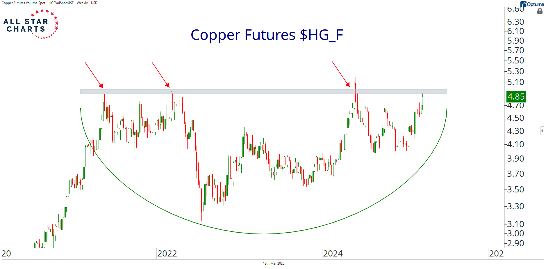 Alfonso's Daily Note Alfonso De Pablos highlights the day’s most important market-moving chart. Dr. Copper’s Turn By Alfonso Depablos, CMT March 13, 2025 It's been a rough tape for U.S. equities these days.When you look around, nothing is working.There are fewer and fewer stocks in uptrends, Staples are outperforming, and the big boys are failing to hold the line.There are times to be aggressive and times to be cautious. Right now, it's about protecting capital.However, there are always pockets of strength that we can lean on. Metals continue to stand out.Nobody is talking about them.Gold just hit 3,000 for the first time in history.Silver is setting up for a move to 50.And Copper keeps pushing at the upper bounds of a multi-year base. That 5 level is the line in the sand for Dr. Copper. Any breakout above this zone will embark it on a fresh leg higher.Looking for uncorrelated trades in this environment has been the right move.Steve and Jason just hosted a live session to break down what’s happening in the market and where we see potential opportunities.They went over international stocks, commodities, energy, and other sectors that are standing out right now.Check it out here!Cheers,Alfonso More from Alfonso's Daily Note Alfonso Depablos, CMT The Return of the Trump Trade November 6, 2025 Alfonso Depablos, CMT Who’s Got It Right? November 5, 2025 Alfonso Depablos, CMT Weak Spots in a Bull Market November 4, 2025 See the Chart That MattersAlfonso’s Chart of the Day highlights the setups and inflection points shaping the next big market moves — before they hit the headlines. You must have JavaScript enabled to use this form. Email Address