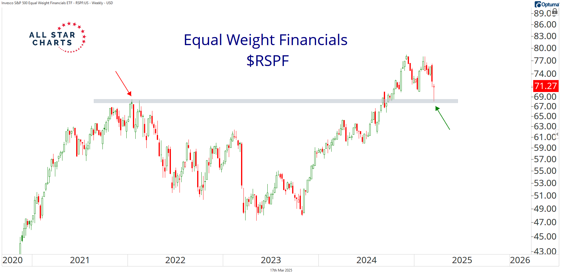 Alfonso's Daily Note Alfonso De Pablos highlights the day’s most important market-moving chart. Financials Remain in the Fight By Alfonso Depablos, CMT March 17, 2025 Just landed in Miami Beach for the Future Proof Citywide—one of the best finance conferences out there.This place is buzzing. People like Josh Brown, Michael Batnick, Tom Lee and Dan are all here. Even Michael Saylor showed up this morning!It’s shaping up to be an incredible week.I rolled in with my friends Steve and Patrick.These gatherings are always an opportunity to catch up, exchange ideas, and soak in the energy of the industry’s best. But back to the markets—after two solid days, U.S. equities are in rebound mode.Now it’s up to the bulls to prove themselves. The strength of this bounce will determine whether they reclaim control or not.When looking for tactical support levels, I tend to focus my attention on pivot lows or key VWAPS.However, when it comes to the bigger picture it’s all about prior-cycle highs at this point.A bunch of sectors have already fallen back below their 2021 peaks, but others are still holding the line. A prime example is the Equal Weight Financials $RSPF. This index gives us a broader representation, making it an excellent gauge for the sector’s overall health. Buyers are stepping in right at the 2021 highs, turning former resistance into support. This is the classic polarity principle in action.It means the market remembers this level from a few years back. It still matters.Many will argue that polarity doesn't work or that there is no price memory going back that far.This chart begs to differ.As long as buyers hold the line, financials remain in the fight. This is a huge one for the bulls.But if this level gives way, it could open the door for further selling pressure in the short and intermediate term. Alfonso More from Alfonso's Daily Note Alfonso Depablos, CMT The Return of the Trump Trade November 6, 2025 Alfonso Depablos, CMT Who’s Got It Right? November 5, 2025 Alfonso Depablos, CMT Weak Spots in a Bull Market November 4, 2025 See the Chart That MattersAlfonso’s Chart of the Day highlights the setups and inflection points shaping the next big market moves — before they hit the headlines. You must have JavaScript enabled to use this form. Email Address