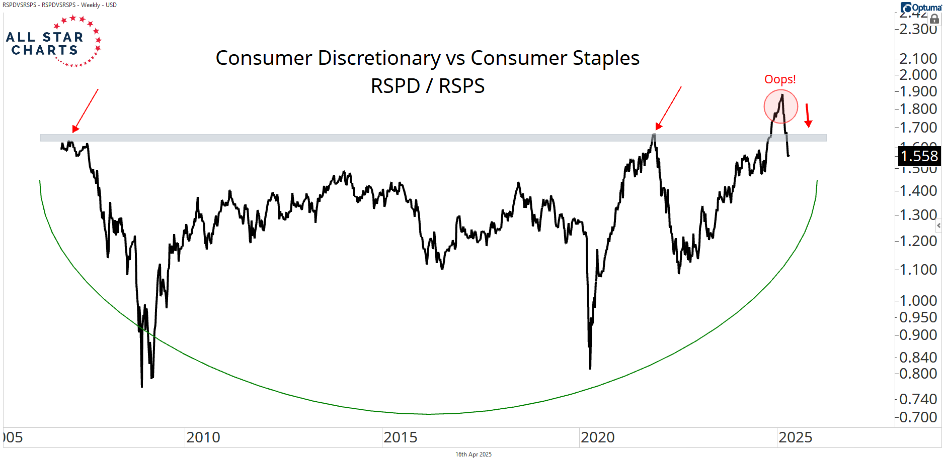 RSPD vs. RSPS broke out of a massive base a few months ago, signaling a potential shift to risk-on. However, the breakout didn’t hold, quickly failing and slipping back into the previous range.