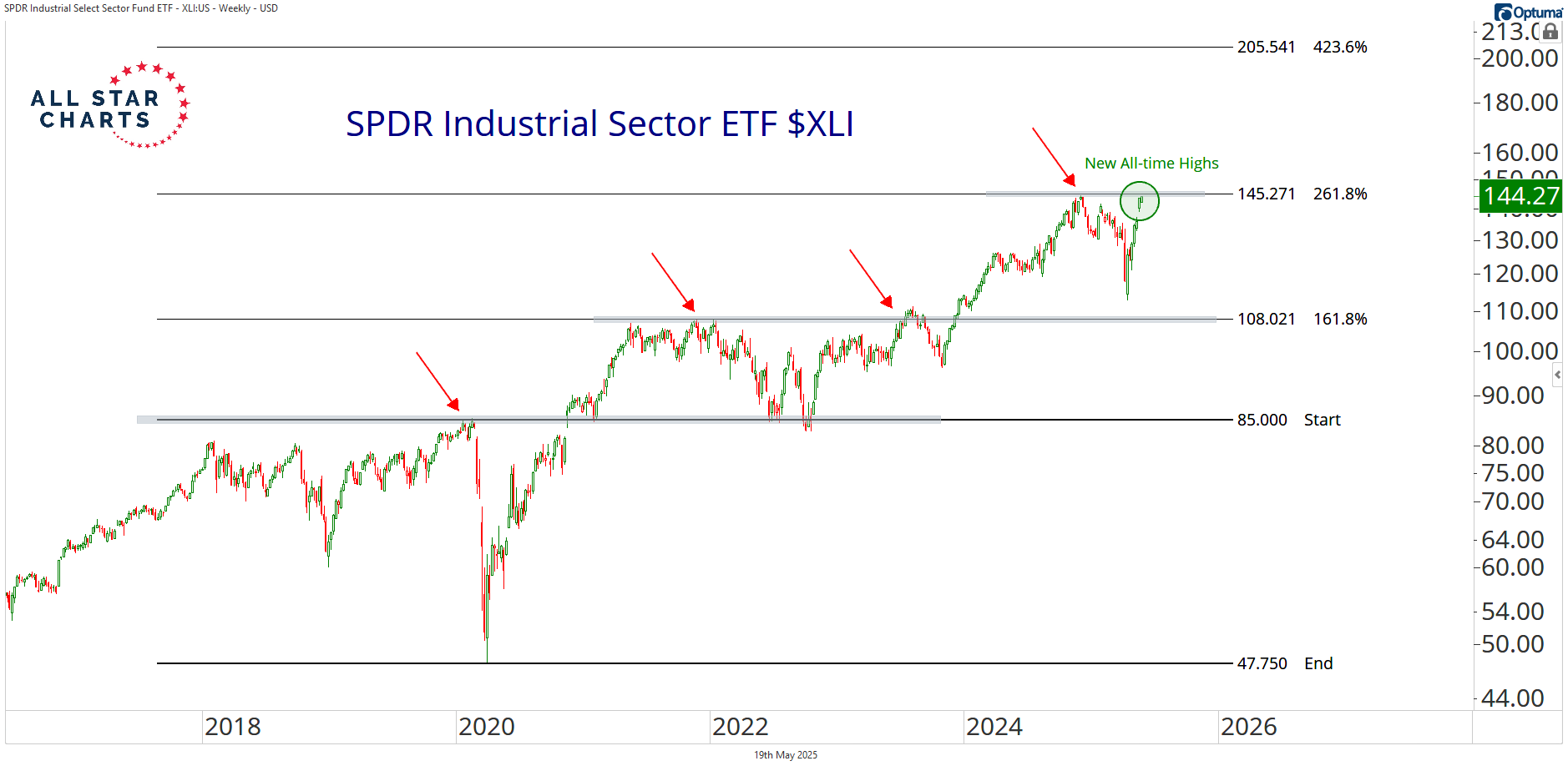 As long as XLI holds above 145, the path of least resistance is higher.
