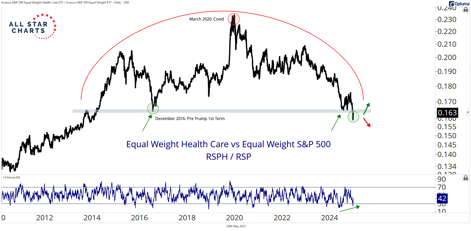 The ratio is sitting right at a major support level. This is the same area that marked the bottom in 2016—right before Trump’s first term.