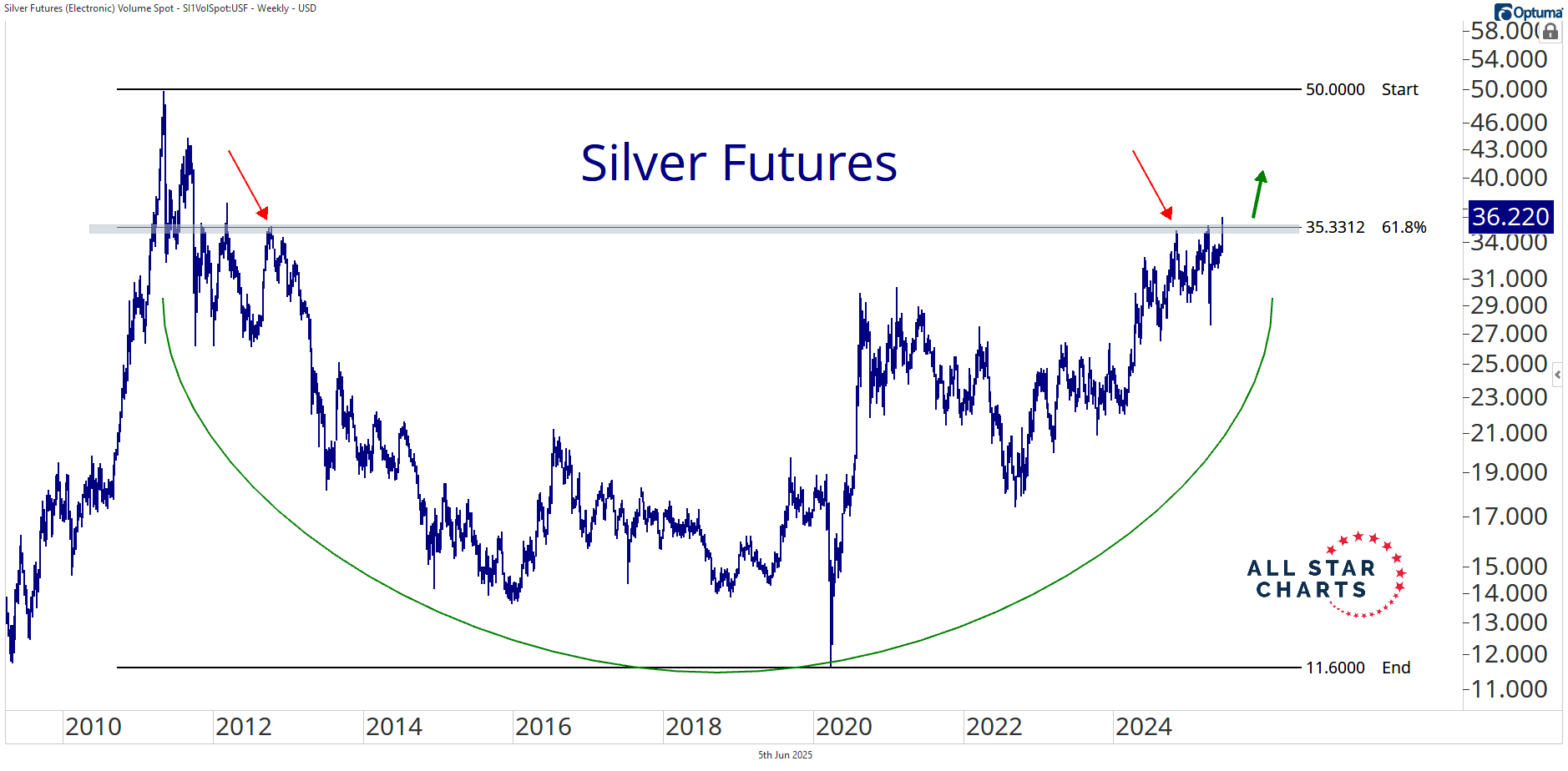Silver is resolving from a massive base and pushing to levels we haven’t seen in over 13 years.