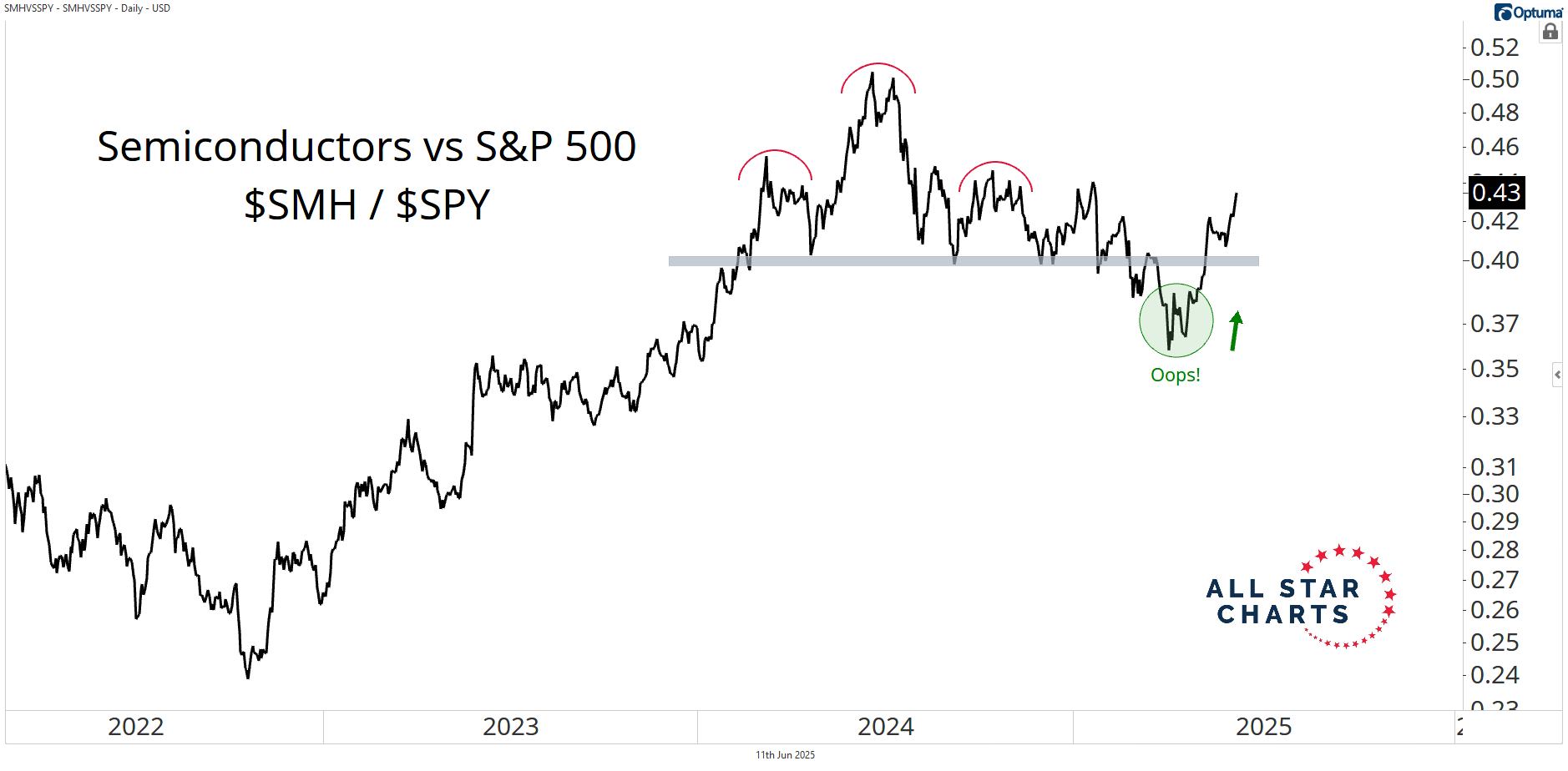 Earlier this year, semis looked like they were about to break down and complete a nasty top relative to the S&P 500.