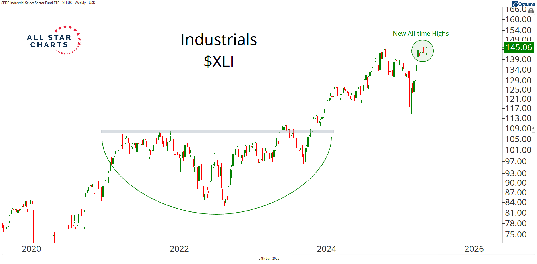 Industrials are breaking out to fresh all-time highs, too.
