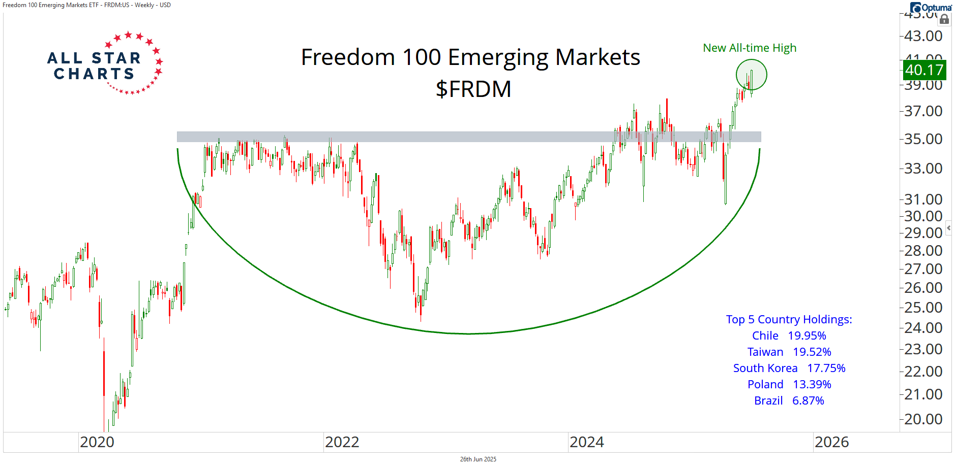 Below, we have the Freedom 100 Emerging Markets ETF $FRDM breaking out of a multi-year base to new all-time highs.