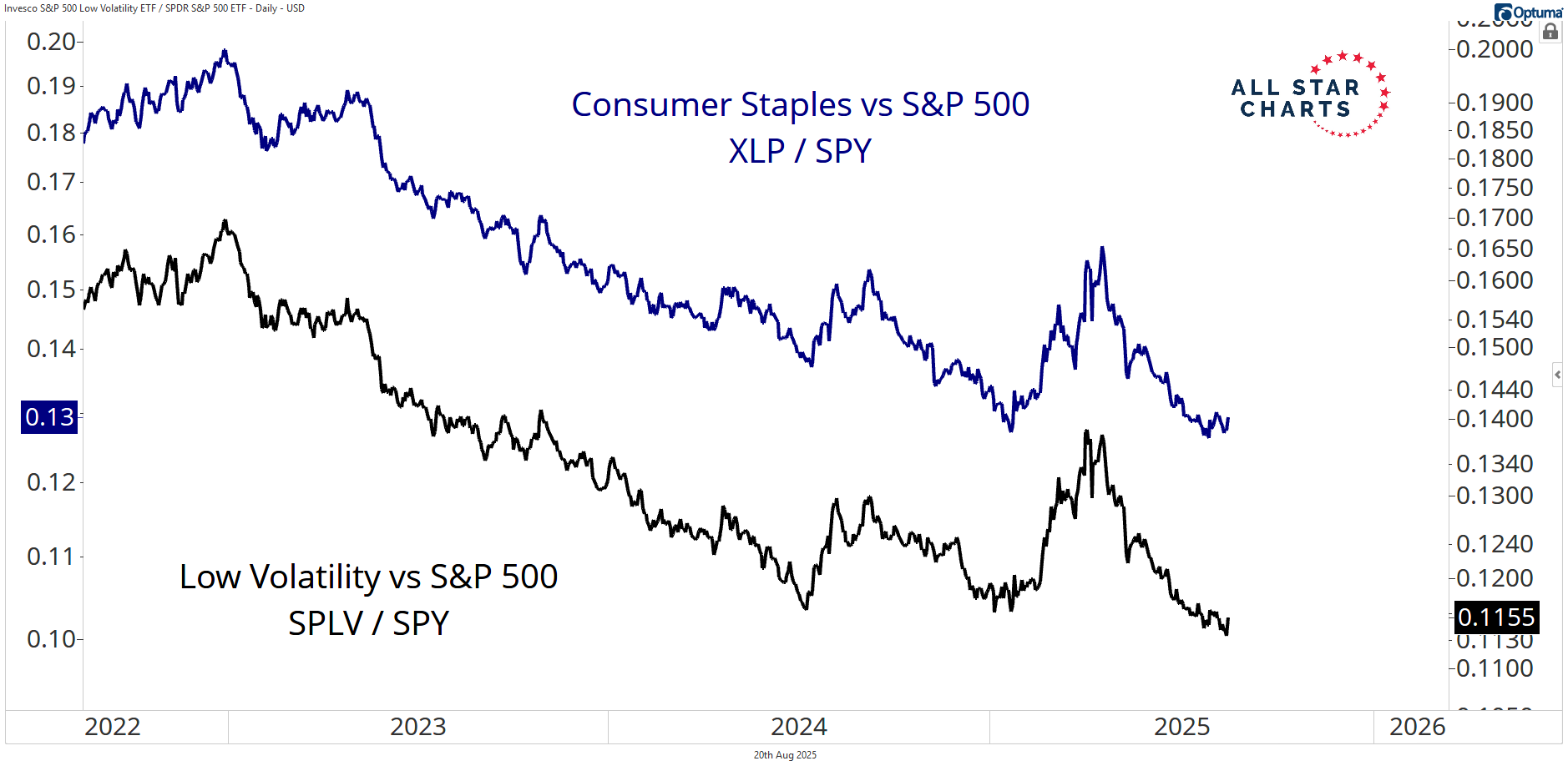 Alfonso's Daily Note Alfonso De Pablos highlights the day’s most important market-moving chart. When Staples Lag, Bulls Party By Alfonso Depablos, CMT August 20, 2025 Sign up for my free note here.This week has been a good reminder that down days are just part of bull markets.Lately, it seems like people are surprised whenever the major averages dip a few points—as if they should go up every single day.The truth is, the market doesn’t run in a straight line. Minor dips happen all the time, even when the overall trend is up.It really comes down to sector rotation and where money is flowing.Watching which sectors lead and which lag tells us a lot about the market’s overall health.What you don’t want to see is defensive sectors outperforming. That’s when we’d start getting cautious.We like to track this by looking at Consumer Staples and Low Volatility stocks relative to the broader market. These ratios have been a great guide this year, helping us stay on track with the primary trend.When equities are under real pressure, investors hide out in Staples and Low Volatility. But right now, they are not.For now, these trends remain lower, and until they start moving up again, we don’t see much reason to expect trouble for stocks.In the meantime, we’ll be focused on identifying fresh long opportunities.We don’t think it’s time to stop buying stocks at all—maybe just time to start looking in some new places.Alfonso More from Alfonso's Daily Note Alfonso Depablos, CMT The Return of the Trump Trade November 6, 2025 Alfonso Depablos, CMT Who’s Got It Right? November 5, 2025 Alfonso Depablos, CMT Weak Spots in a Bull Market November 4, 2025 See the Chart That MattersAlfonso’s Chart of the Day highlights the setups and inflection points shaping the next big market moves — before they hit the headlines. You must have JavaScript enabled to use this form. Email Address
