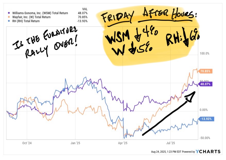 Friday afternoon, just hours after Jerome Powell was pressured into signalling a September rate cut, the white house announced a tariff carve out for furniture. Williams-Sonoma ($WSM), Wayfair ($W) and RH ($RH), which import a huge % of products from China, all saw their shares hit hard after hours.
