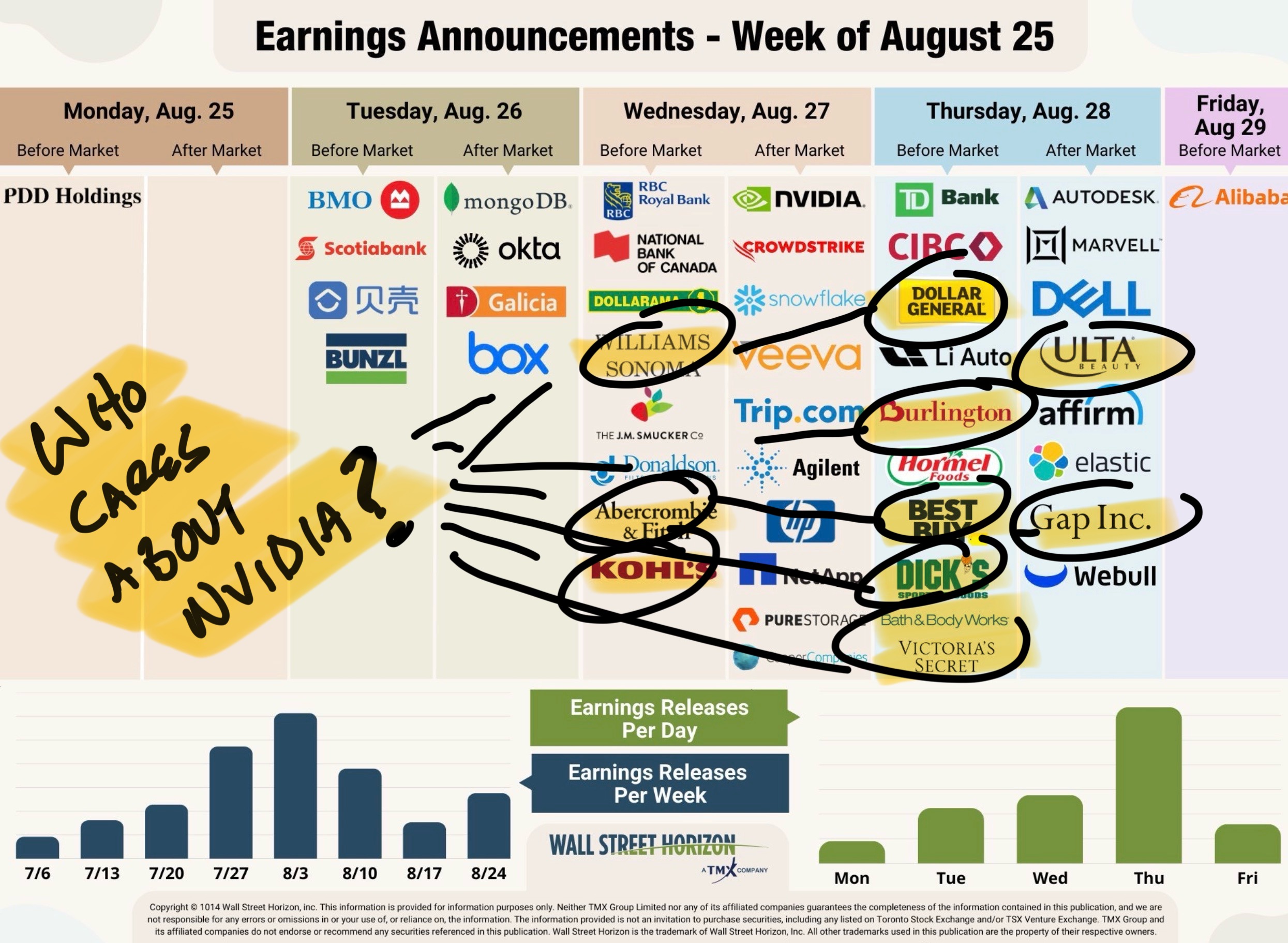 It's the last week of summer and the biggest week of the year as retail earnings hit maximum intensity in the next 5 days. Here's what I'm watching while most of the other adults are on vacation: