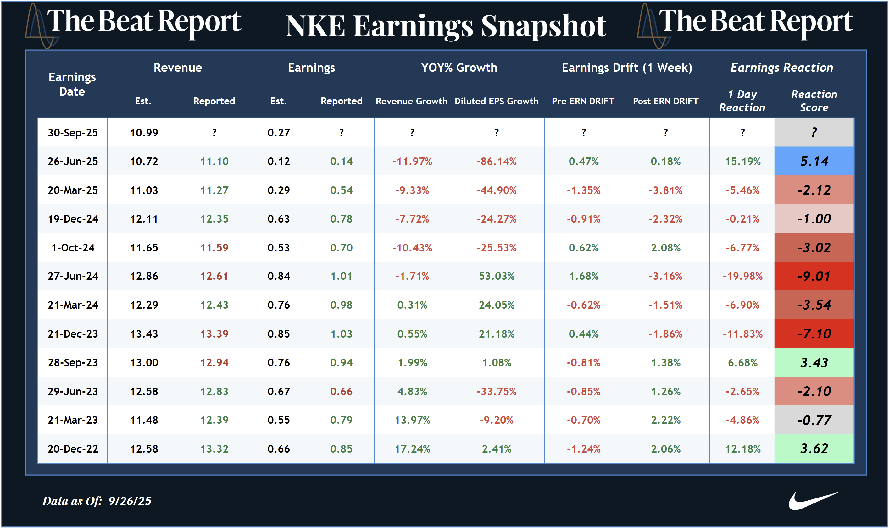 Nike is coming off one of its longest beatdown streaks ever. From late 2023 to early this year, the stock had six consecutive negative earnings reactions.