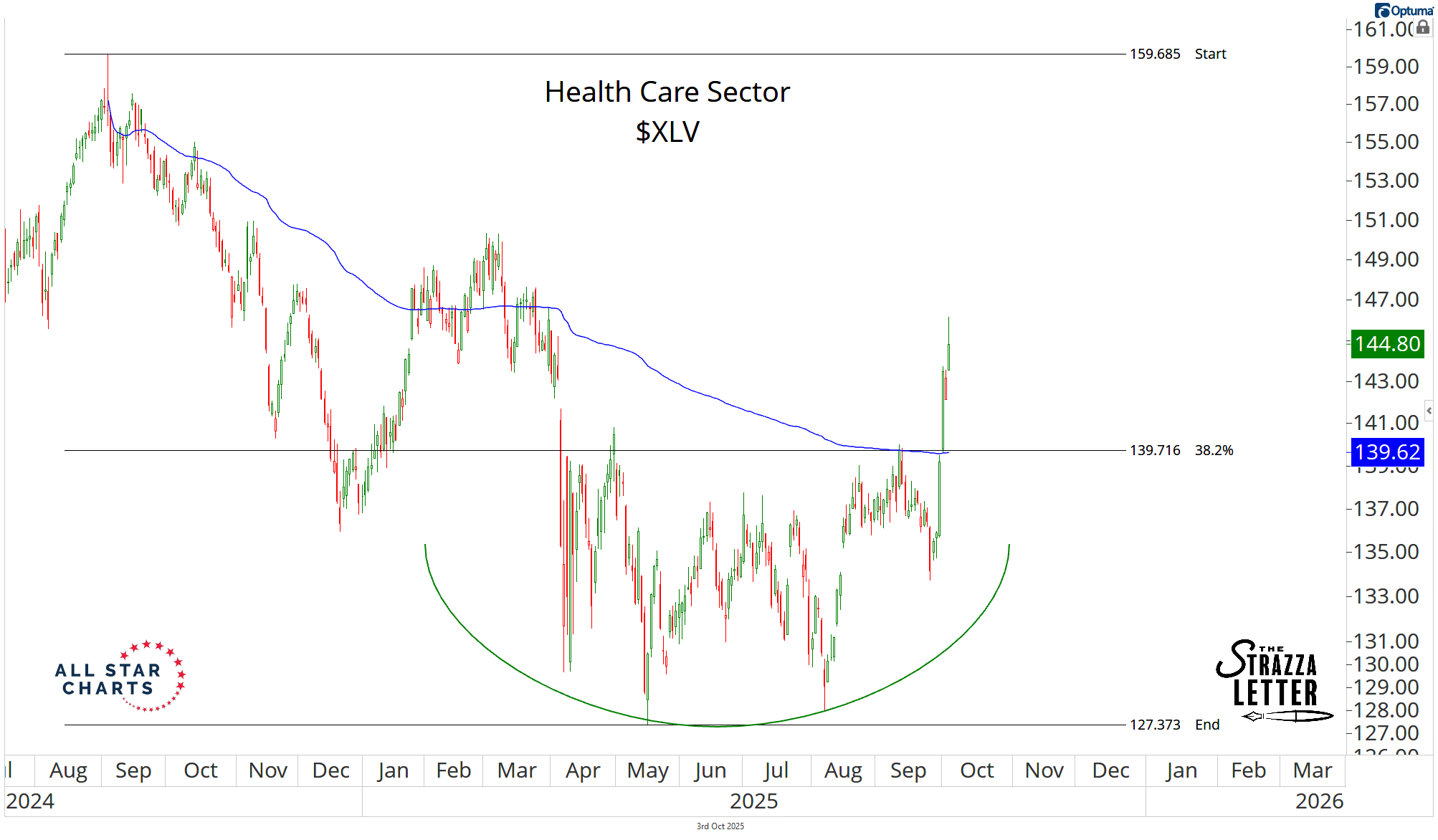Here’s SPDR Health Care $XLV zoomed out about 10 years with the 2-day rate of change in the lower pane: