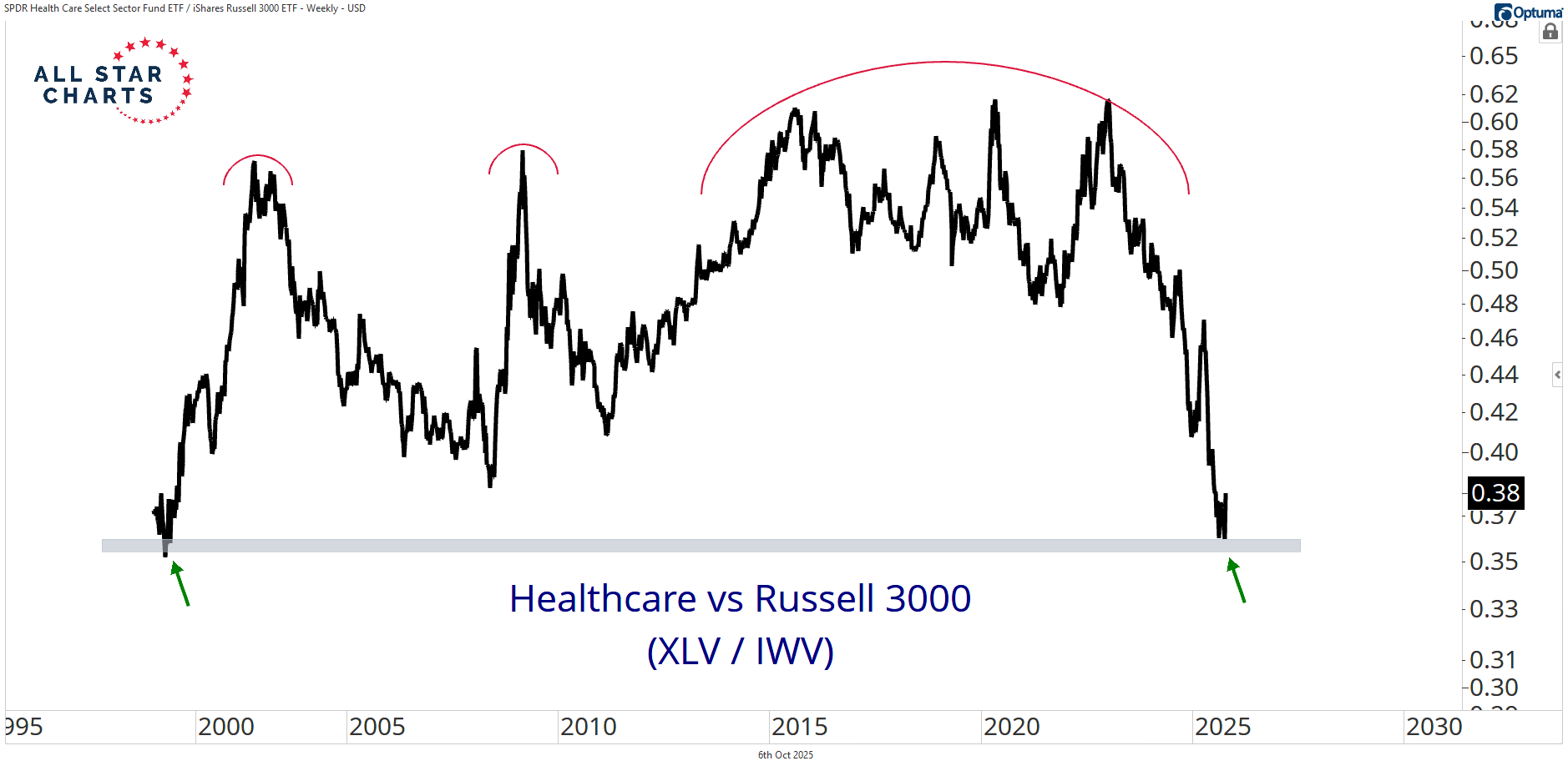 Alfonso Depablos, CMT Healthcare’s Turn October 6, 2025 One of the things I love most about bull markets is how they eventually come for everything.The winners drag the losers along. Leaders expand, laggards catch up, and even the weakest groups finally get their turn.That’s broadening participation in action. It’s sector rotation.That’s why I’ve been keeping an eye on Healthcare.This sector has been largely forgotten over the past two years, but that could be about to change.Take a look at the SPDR Healthcare ETF $XLV relative to the Russell 3000 $IWV: If there’s ever a place for Healthcare stocks to stop underperforming, wouldn’t this be it?And honestly? I think it is.This ratio is back to the same levels it was trading at in 2000.Being a Healthcare investor hasn’t been easy, but extremes like this rarely last forever.If this sector is going to join the bull run — maybe even take a leadership role — this is the moment, at least for a while.Our team is putting together a deep dive on Pharma stocks, packed with fresh setups and actionable trade ideas.Join ASC Premium today to get the report, risk-free.Stay sharp,Alfonso De PablosDirector of Research, All Star Charts Filed Under: ASC, Alfonso Share Article