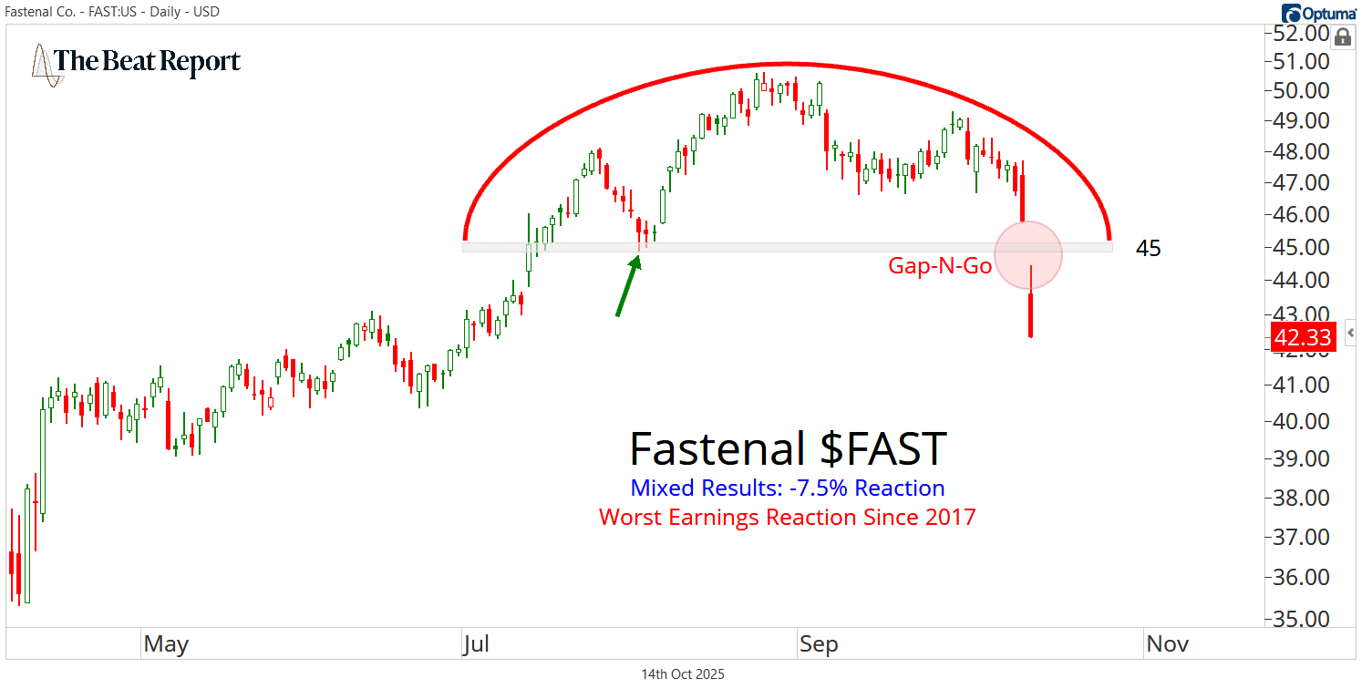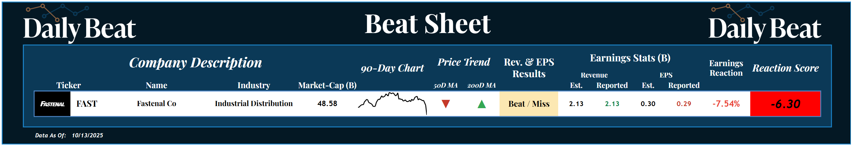 The only earnings reaction on Monday came from the $48B supplier of fasteners, tools, and safety gear, Fastenal $FAST, which reported mixed headline results, and suffered a -6.30 reaction score.