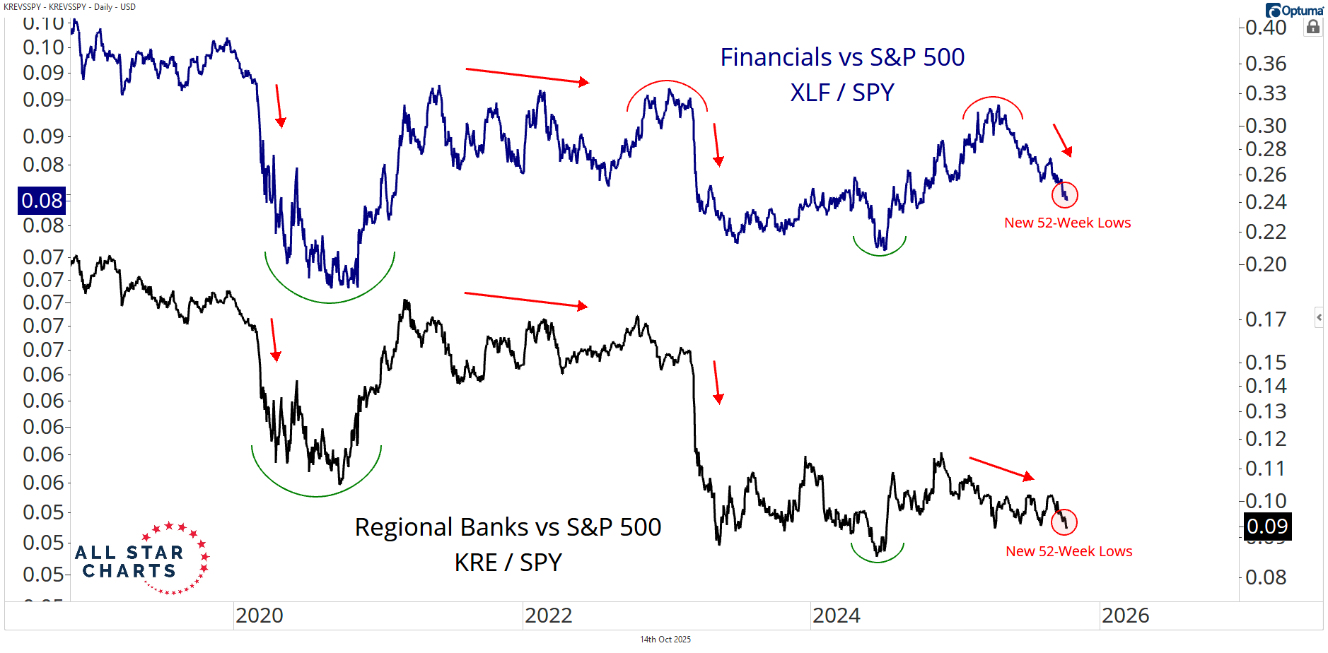 Right now, both the Financial Sector and Regional Banks are hitting new 52-week lows relative to the S&P 500.