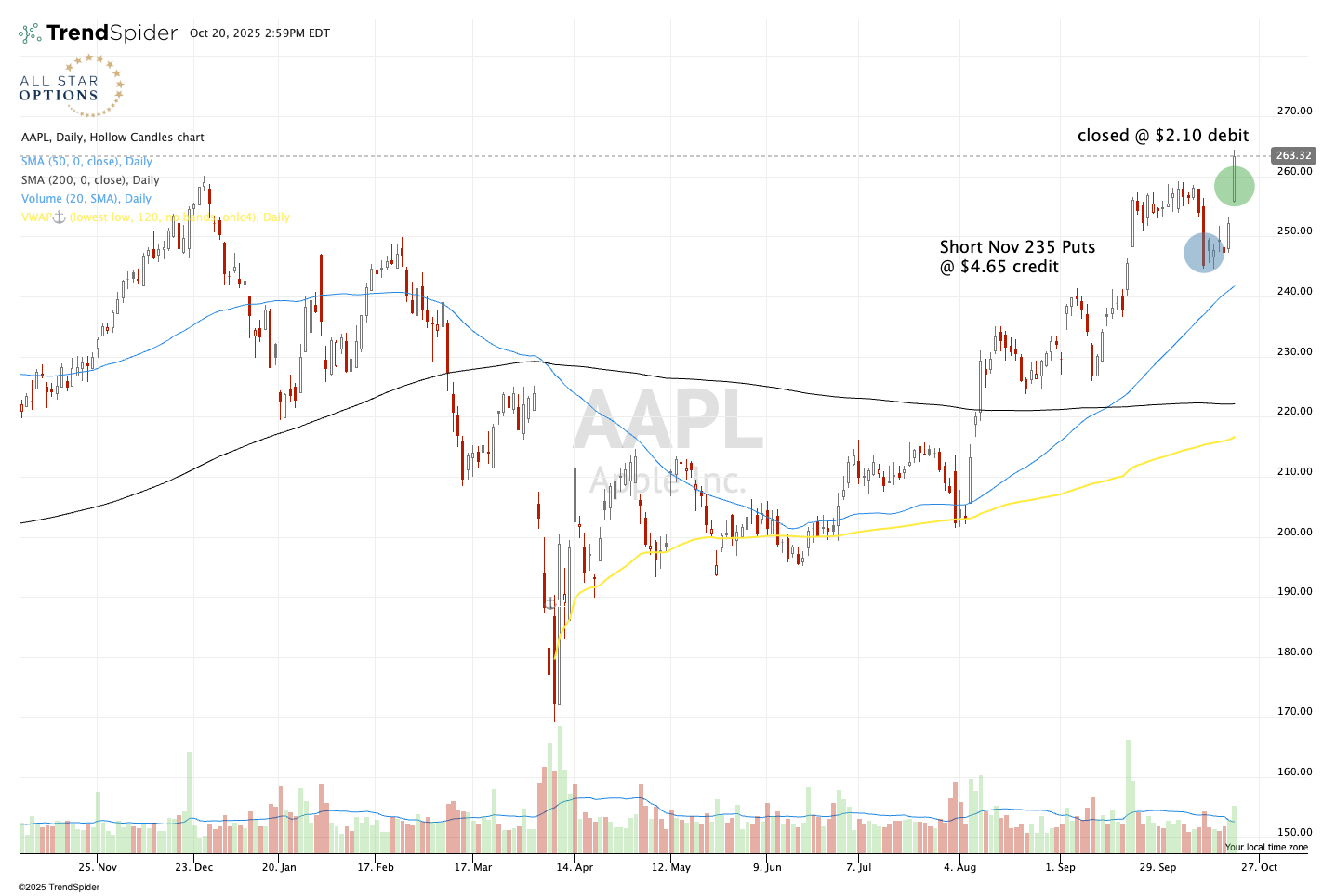 In All Star Options, we recently did exactly this trade in Apple $AAPL. On October 10th, with the stock falling and volatility rising, I noticed the rising 50-day moving average coming up to offer nearby support. Additionally, $240 had been resistance a couple months back and looked ready to flip into support.