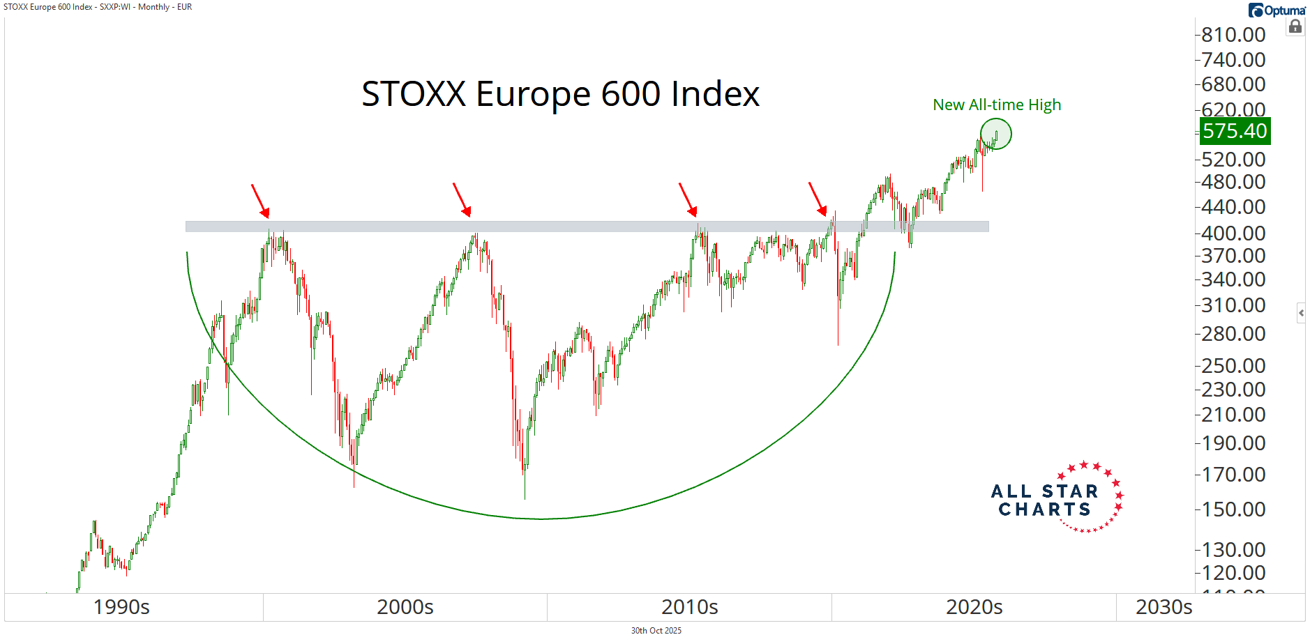 Alfonso's Daily Note Alfonso De Pablos highlights the day’s most important market-moving chart. Not Just 7 Names By Alfonso De Pablos, CMT October 30, 2025 I keep hearing that this market’s being carried by just a handful of names.But when you zoom out, that story falls apart pretty quickly.Outside the U.S., things are looking a lot stronger than most people realize.Take Europe, for example.We’re talking about some of the most boring, low-tech stocks out there — and yet, they’re crushing it this year.Whether or not you own them, they help put the market’s strength into perspective.The chart below shows the Stoxx Europe 600 Index breaking out to new all-time highs. This is the broadest measure of European equities — including small-, mid-, and large-caps. Think of it like the S&P 1500.If Europe’s holding up this well, it’s tough to argue that things are falling apart.If there were real stress under the surface, we’d be seeing it overseas — but we’re not.In fact, quite the opposite. The uptrends across Spain, Italy, and Greece are as resilient as ever.That’s not defensive money hiding out — that’s investors embracing risk.And as long as that continues, it’s hard to bet against this bull market.Let me know what you think — I’d love to hear from you.Stay sharp,Alfonso De Pablos, CMTDirector of Research, All Star Charts More from Alfonso's Daily Note Alfonso De Pablos, CMT I’m Buying This Base December 12, 2025 Alfonso De Pablos, CMT Copper’s Turn Is Coming December 11, 2025 Alfonso De Pablos, CMT Little Giants December 10, 2025 See the Chart That MattersAlfonso’s Chart of the Day highlights the setups and inflection points shaping the next big market moves — before they hit the headlines. You must have JavaScript enabled to use this form. Email Address