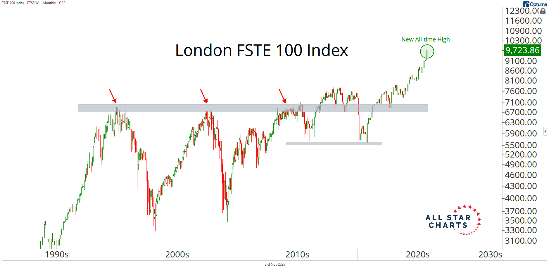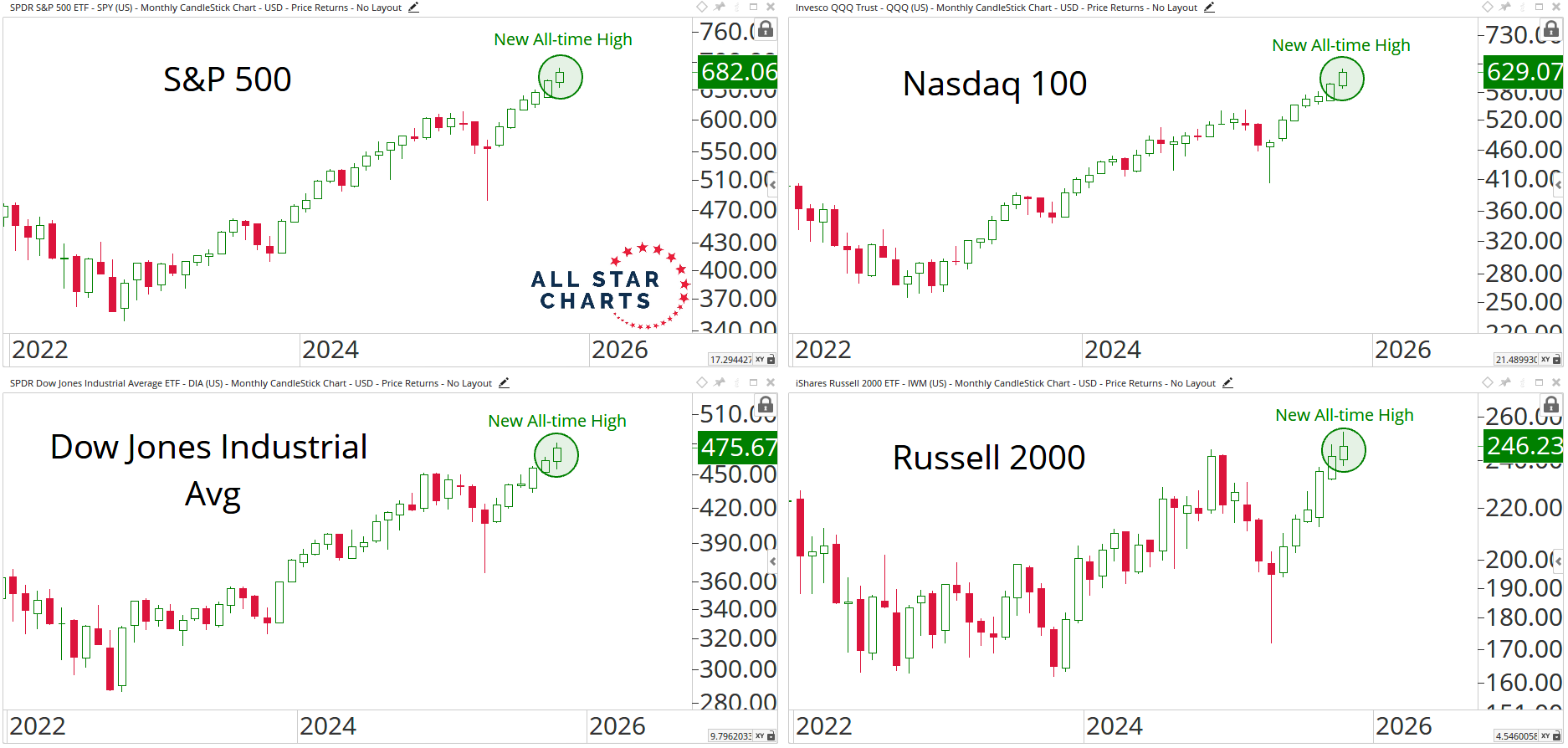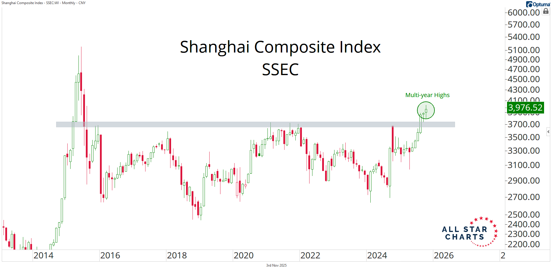 Alfonso's Daily Note Whenever in Doubt, Zoom Out By Alfonso Depablos, CMT November 3, 2025 Do you want to know our cheat code here at ASC?It’s the Monthly Candlesticks.“Whenever in doubt, zoom out.” That’s how I learned it from JC many years ago.The beauty of monthly charts is that they make it impossible to ignore the primary trend. And that’s what this game is all about.Think about it.We live in a world where information moves faster than ever — it’s easy to get lost in what’s happening today, with all the media noise.That’s where the Monthly Candlesticks come in.The ability to step back, zoom out, and identify the direction of the main trend is a superpower.We only get these 12 times a year — and they’re worth paying attention to.So let’s zoom out and put things in perspective.The S&P 500, Nasdaq 100, Dow Jones Industrial Average, and Russell 2000 all just closed the month at new all-time highs. From large- to small-caps. That looks more like broad participation than a lack thereof.And what do we know about all-time highs?They’re not characteristics of downtrends.This is not only happening in the U.S.Go look around.European equities have been ripping this year.These indexes are built different. They’ve got zero exposure to tech and growth stocks.Here's the London FTSE 100 Index trading at its highest level in history. And how about China?The Shanghai Composite Index just broke out to multi-year highs. Chinese stocks have been a hot spot lately.I love how people dismiss them just because they “don’t trust” them.Meanwhile, they’re quietly breaking out.Tonight, Monday at 8PM ET, JC will be breaking all of this down — and a lot more.If you’re not a Premium Member yet, click here to join risk-free.Stay sharp,Alfonso De Pablos, CMTDirector of Research, All Star Charts More from Alfonso's Daily Note Alfonso Depablos, CMT Not Just 7 Names October 30, 2025 Alfonso Depablos, CMT Bull Market Behavior October 28, 2025 Alfonso Depablos, CMT Seasonal Tailwinds October 27, 2025 Sign Up TodayGet expert market insights delivered straight to your inbox. You must have JavaScript enabled to use this form. Email Address