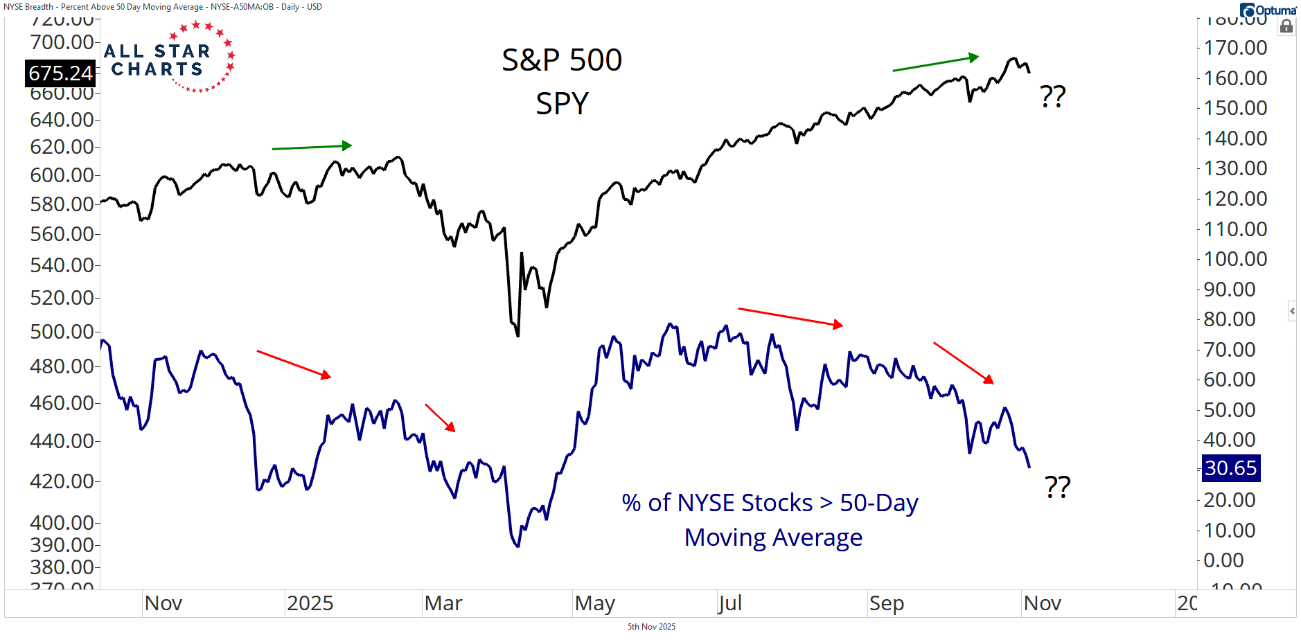 That means more and more stocks are slipping below their short-term trends — even as the indexes hold steady near highs.