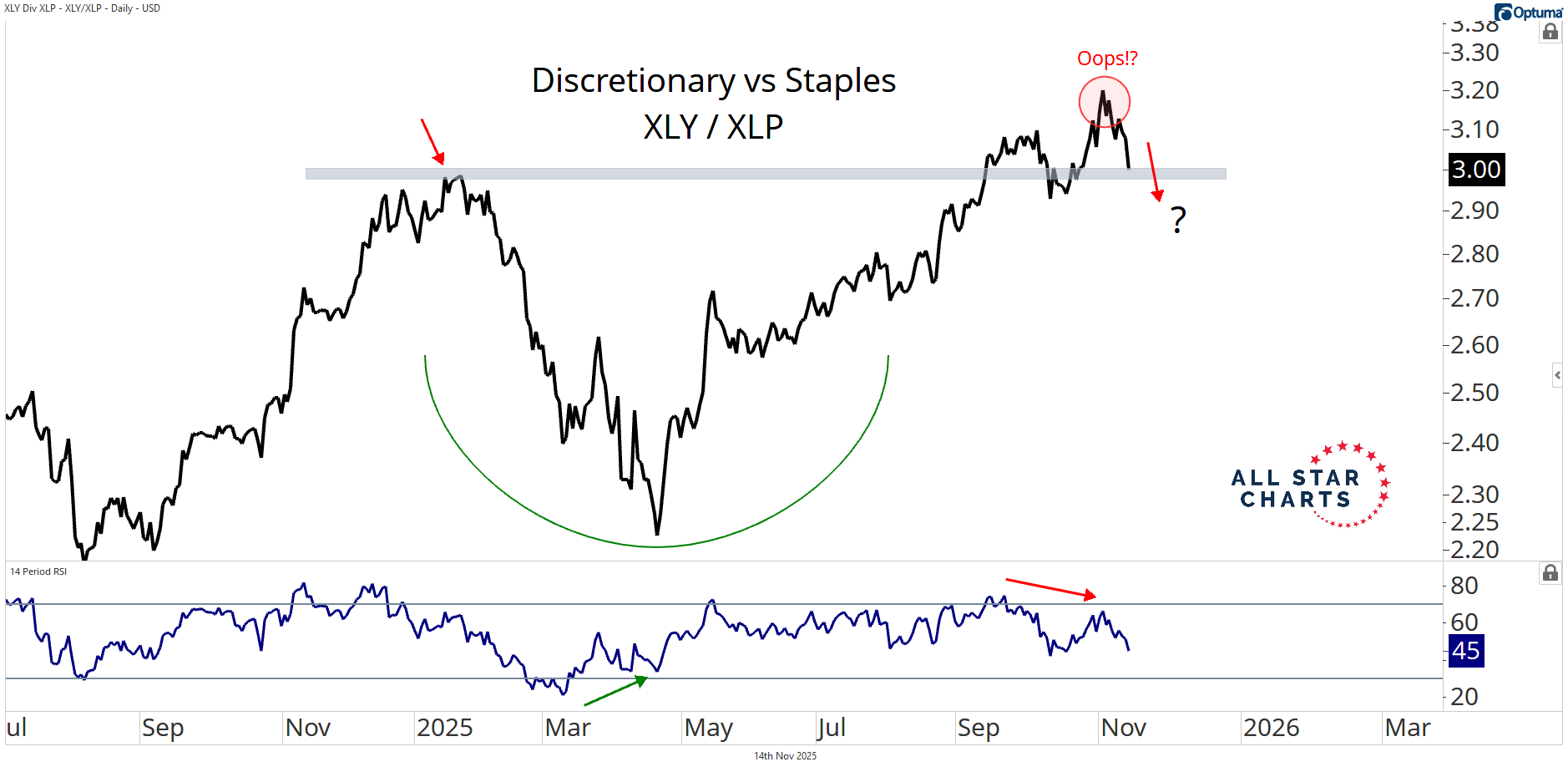 When things get this messy, I like to fall back on one of the simplest — and most reliable — risk gauges I’ve leaned on throughout my career: the ratio between Consumer Discretionary and Consumer Staples.