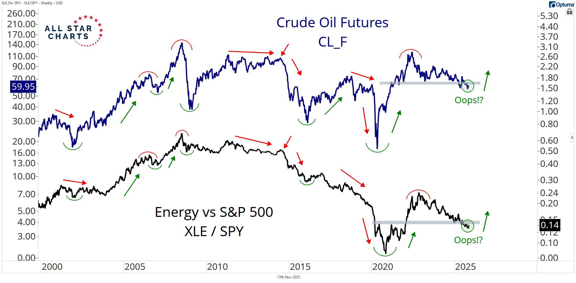 Alfonso's Daily Note Alfonso De Pablos highlights the day’s most important market-moving chart. What If These Aren’t Tops? By Alfonso De Pablos, CMT November 17, 2025 Sometimes the biggest moves come from patterns that don’t behave the way everyone expects.They trap the majority, shake people out, and then make the real move when no one’s positioned for it.And I’ve gotta say… Energy is starting to look like one of those situations.This chart below represents Energy stocks relative to the S&P 500, overlaid with Crude Oil futures. They look almost identical — and for the past couple of years, both have been carving what many would call “major tops.”But here’s the twist…What if those tops aren’t tops at all?If these end up being failed breakdowns, then look out for a ripper.One of the first things I learned is that failed moves tend to lead to fast moves in the opposite direction.That hasn’t happened yet — but if it does, the setup for a serious squeeze higher is very real.In that scenario, Energy $XLE finally breaking above its 2008 highs isn’t some fantasy — it’s the natural next step.Let me know what you think! I would love to hear from you!Alfonso De Pablos, CMTDirector of Research, All Star Charts More from Alfonso's Daily Note Alfonso De Pablos, CMT Divergence City November 21, 2025 Alfonso De Pablos, CMT What if These Are Tops? November 18, 2025 Alfonso De Pablos, CMT Offense vs Defense November 14, 2025 See the Chart That MattersAlfonso’s Chart of the Day highlights the setups and inflection points shaping the next big market moves — before they hit the headlines. You must have JavaScript enabled to use this form. Email Address