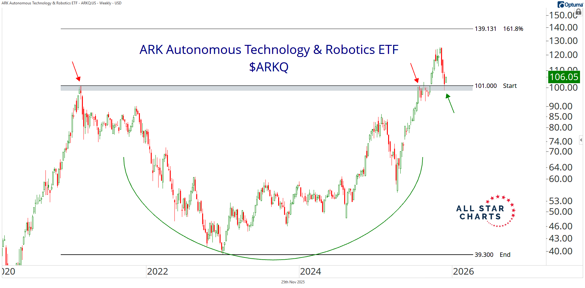 Here’s a clean chart of ARK Autonomous Technology & Robotics $ARKQ, pulling back to former cycle highs.