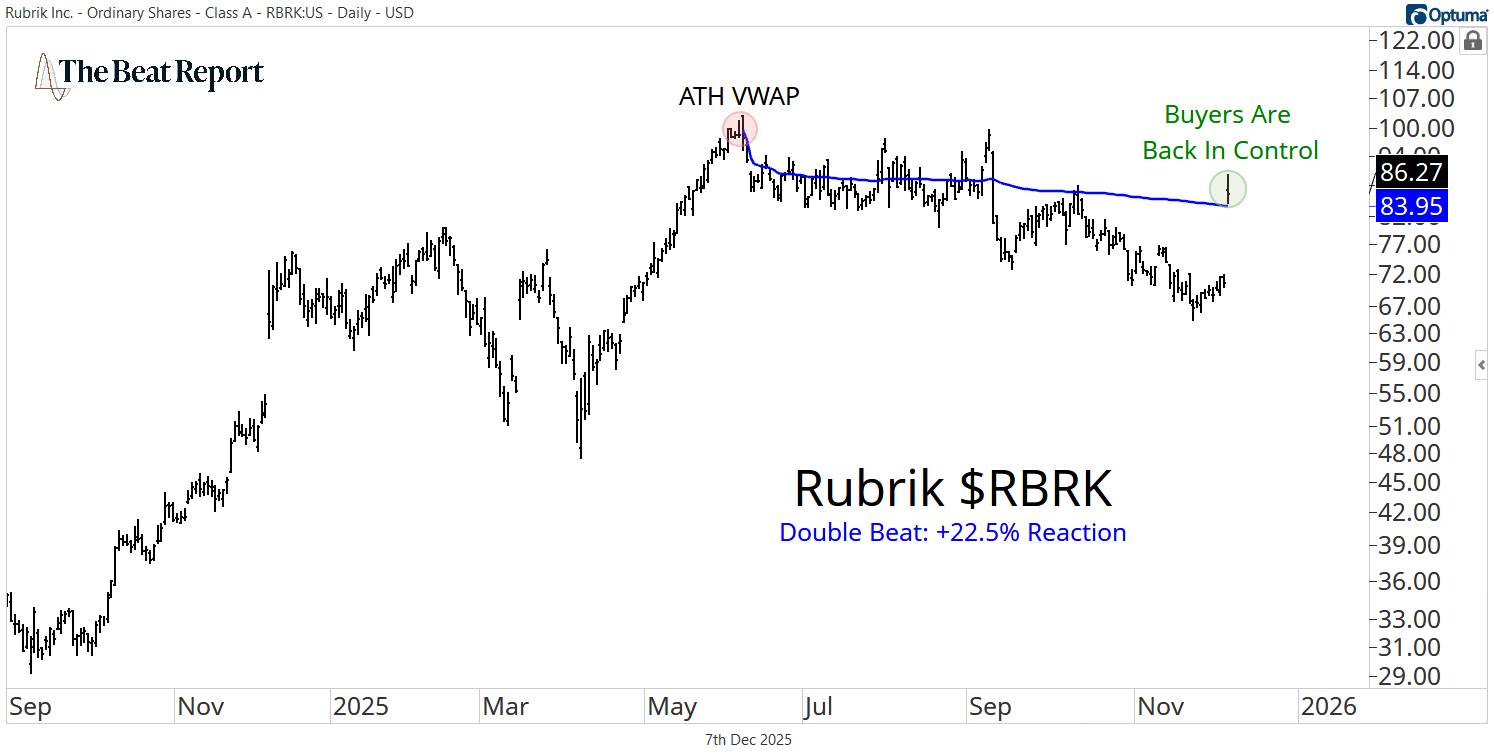 Heading into the earnings report, RBRK had stuck below the volume-weighted average price anchored to the all-time high, signaling the sellers were in control.