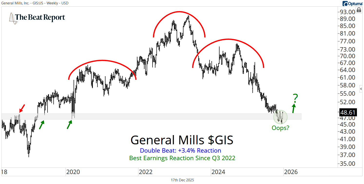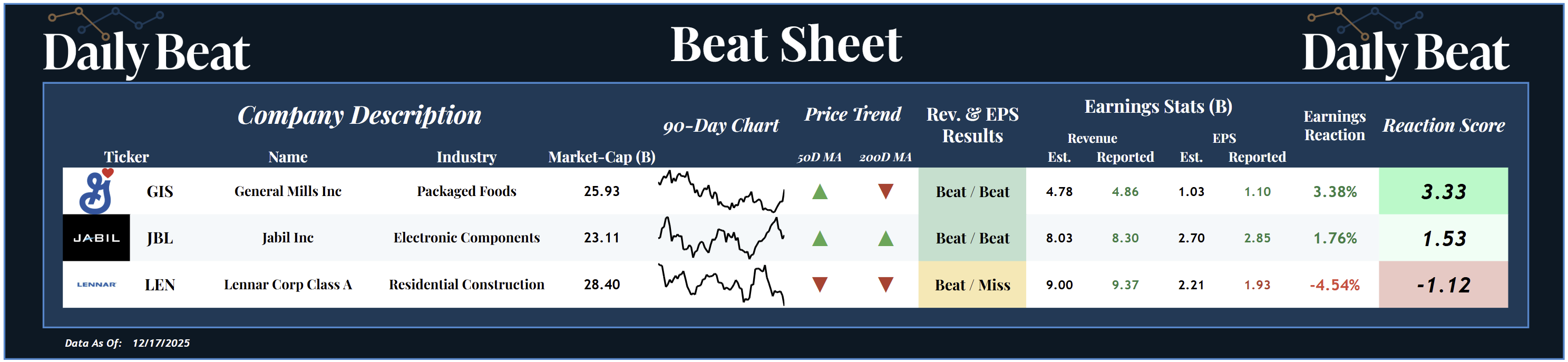 At the top of Wednesday's Beat Sheet was the $26B packaged foods stock, General Mills $GIS. Following a double beat, shareholders were rewarded with a +3.33 reaction score.