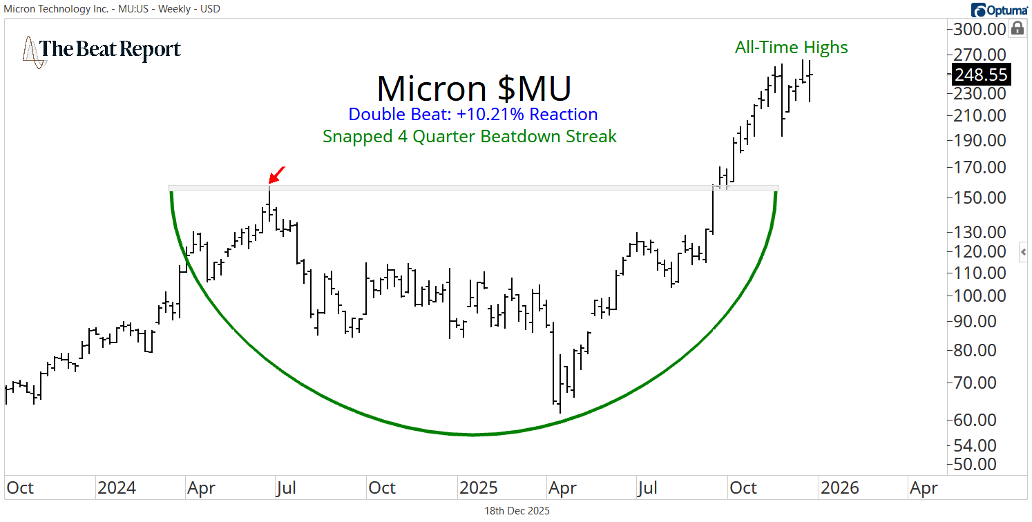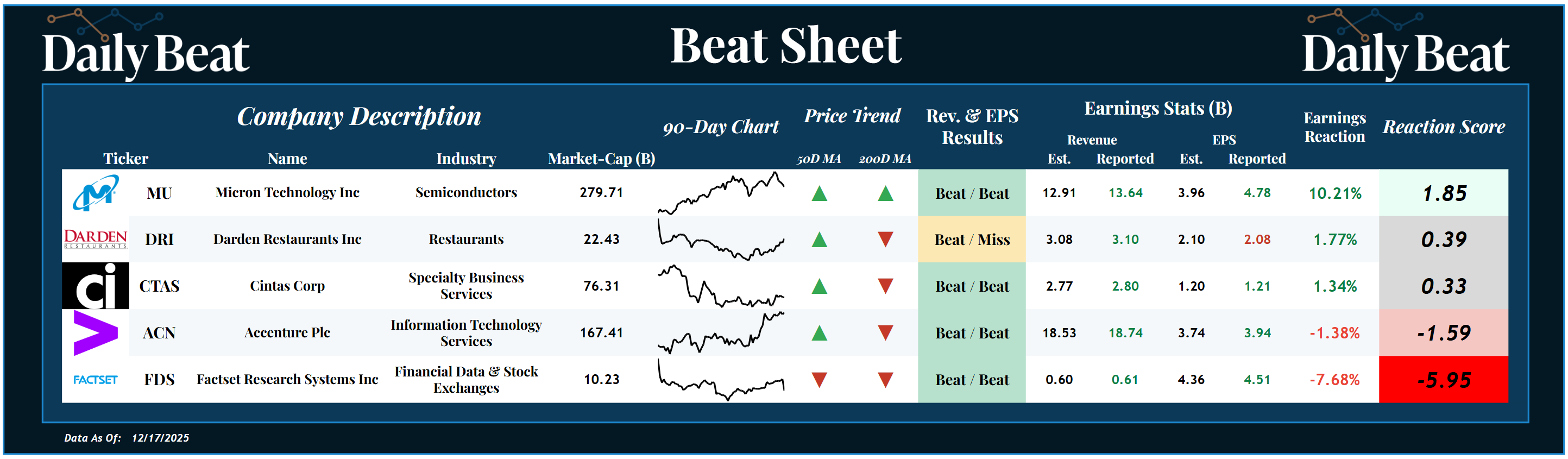 At the top of Thursday's Beat Sheet was the $280B semiconductor stock, Micron $MU. Following a double beat, shareholders were rewarded with a +1.85 reaction score.