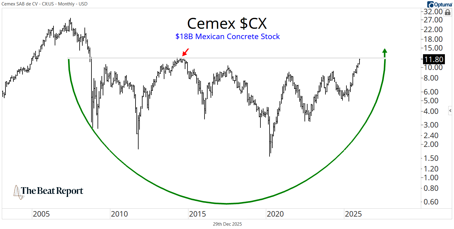 CX is pressing up against the upper bound of a massive base that stretches back decades. It’s one of the most significant structural reversal patterns in the market.