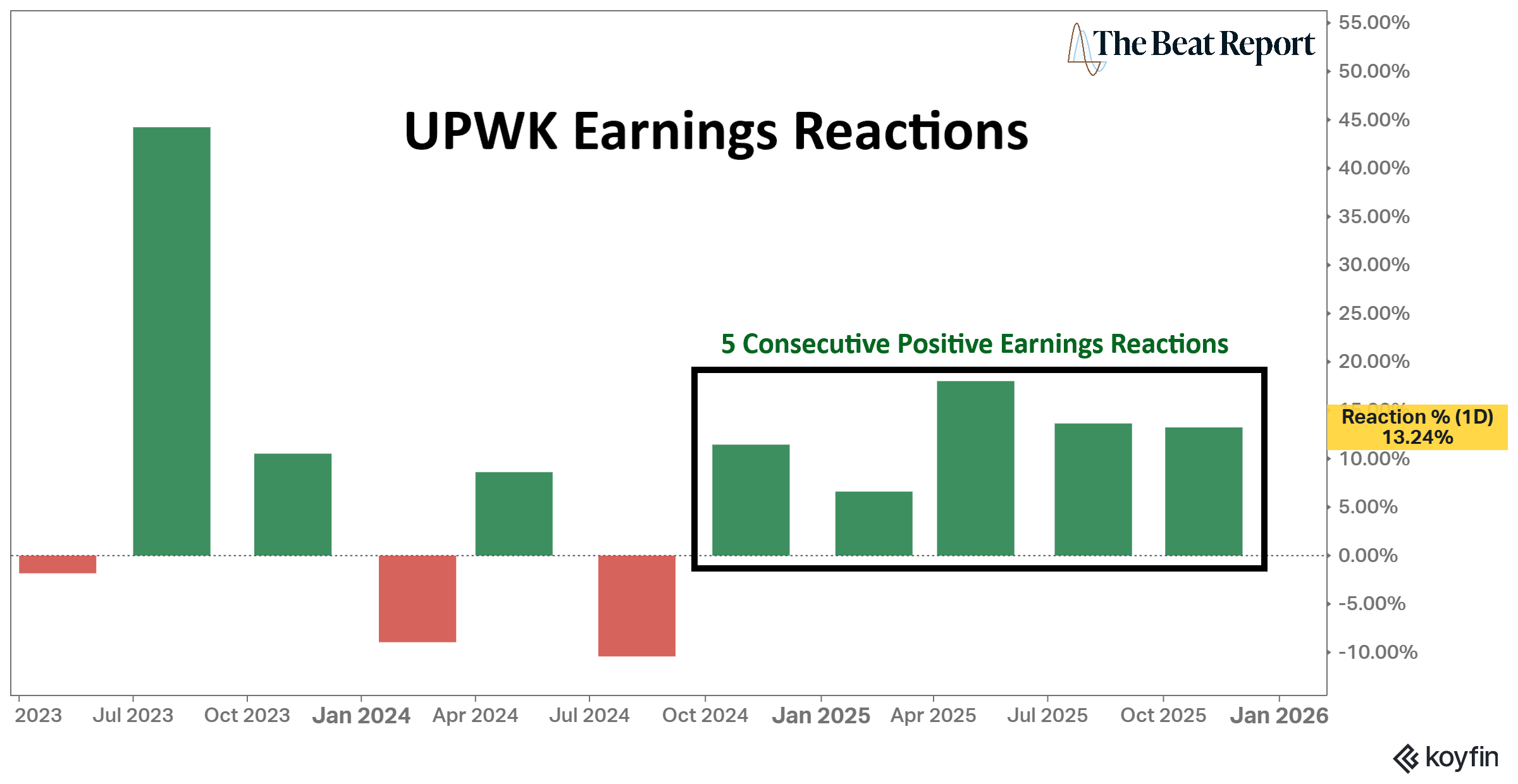 The latest report triggered a +13% post-earnings move, and it wasn’t an isolated event. Upwork has now been rewarded for five consecutive earnings reports, a stark contrast to the choppy, often negative reactions that defined the stock’s prior regime.